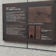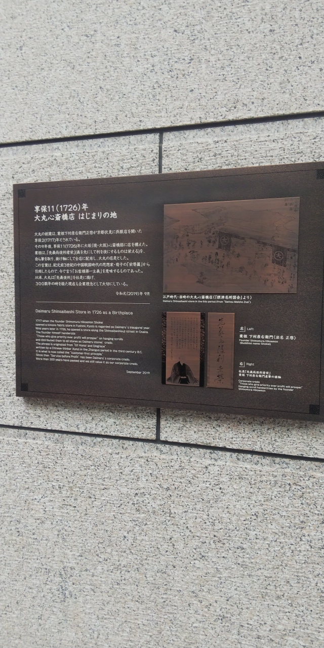 大丸のはじまりは京都の伏見ですが、大阪に居を構えたのはこの地が始まりだそうです。それを表す説明の看板が壁に埋め込まれていました。1726年からというと約300年近くで、すごい歴史を感じさせてくれます。