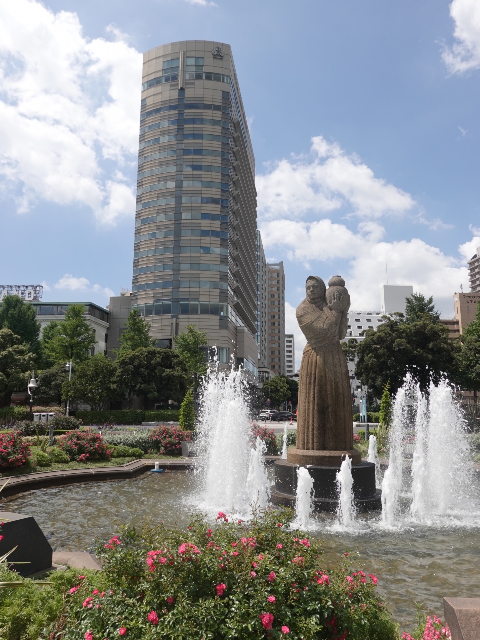 山下公園の一画、ホテルニューグラウンドのタワーに近いエリアにある噴水の中央に「水の守護神像」があります。横浜と姉妹都市の米・カリフォルニア州のサンディエゴから寄贈されたものということです。昭和35年に設置されたとのこと、70年の歴史を感じる印象的な像でした。