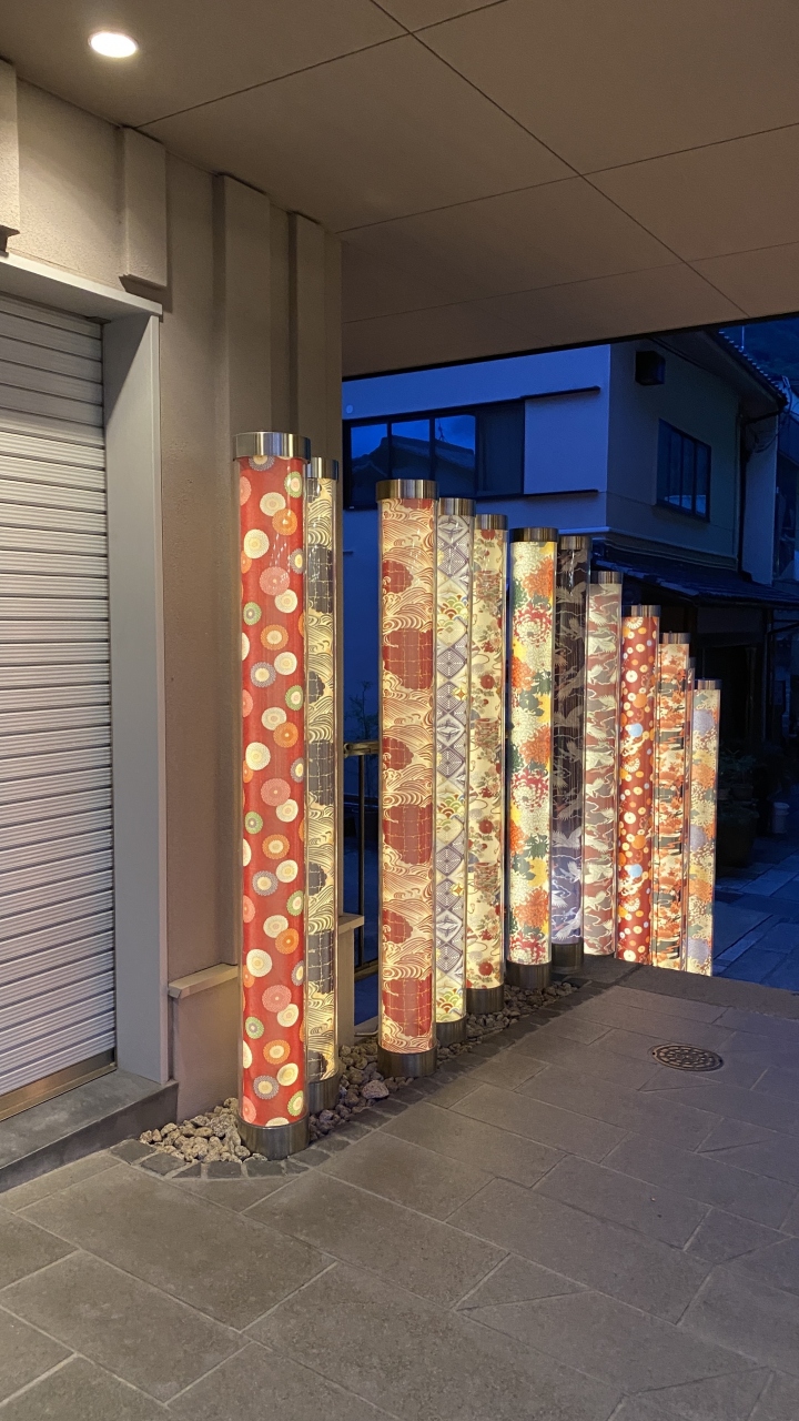 着物を筒状のプラスティックの箱にいれてらいとあっぷさせるものなのですが、なかなか風情があって良い場所です。嵐電の駅がこの装飾で覆われているのですが、まさにその名もKIMONO FOREST の通り、着物の森のような場所になっています。