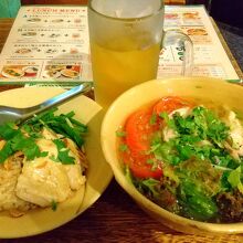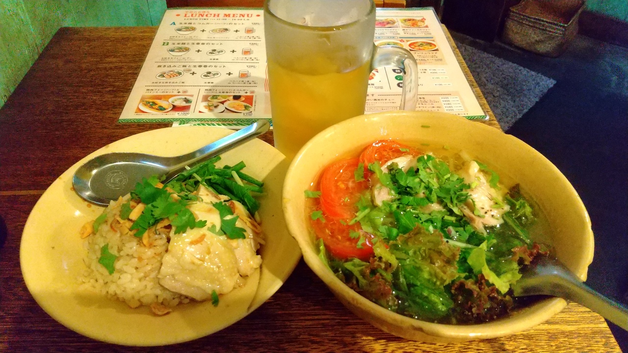 ランチで頂いたのは、鶏肉とトマトのフォーとハーフチキンライスのセット。どちらも本格的でとても美味しく、ドリンク付きで980円とコスパもとても良かったです。