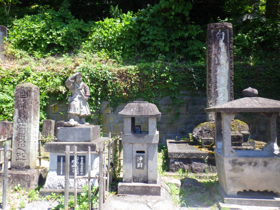 「白虎隊十九士の墓」からちょっと下った墓所に「白虎隊士自刃の地」がありました。白虎隊士の石像は鶴ヶ城を見据えているということで、眼下には会津若松の町並みが広がっていましたが、建物が増えたせいか残念ながら鶴ヶ城を発見することはできませんでした。