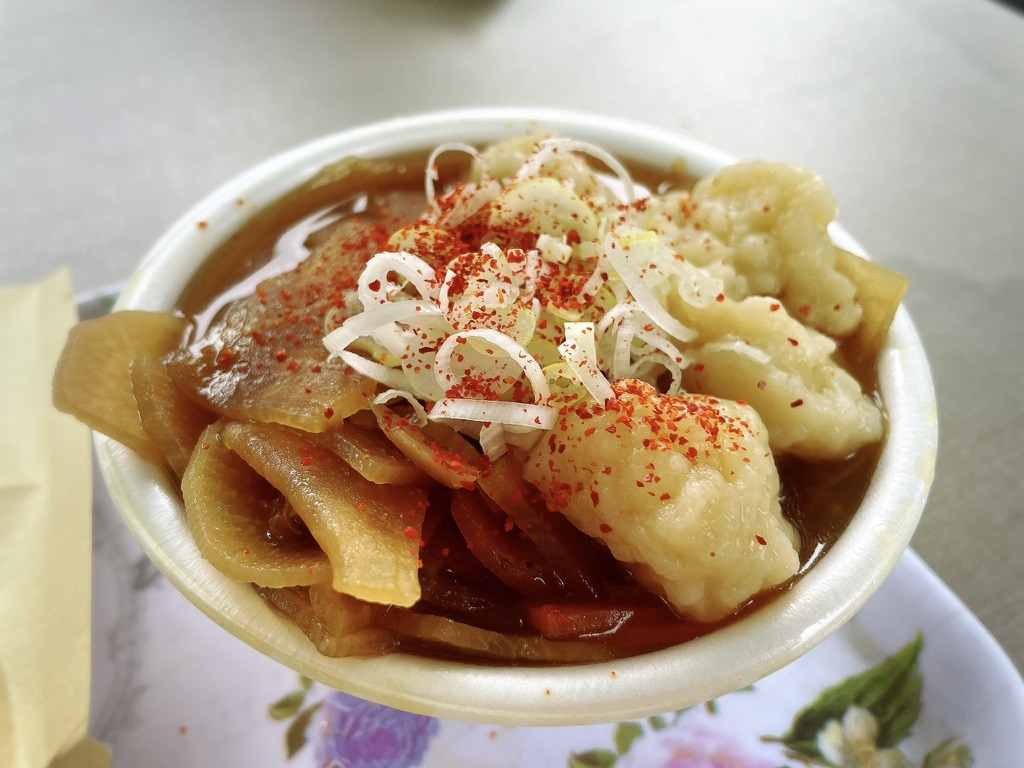 華厳の滝のエレベーター乗場手前にあるお店。いくつかお店が集まっている場所なのですが、エレベータ乗場に向かって左側にある屋台のようなお店で、すいとんと餃子コロッケが推しのようです。すいとんは400円と安く、野菜がたくさん入っていて満足感あります。個人的にはちょっと味が濃かったかな。