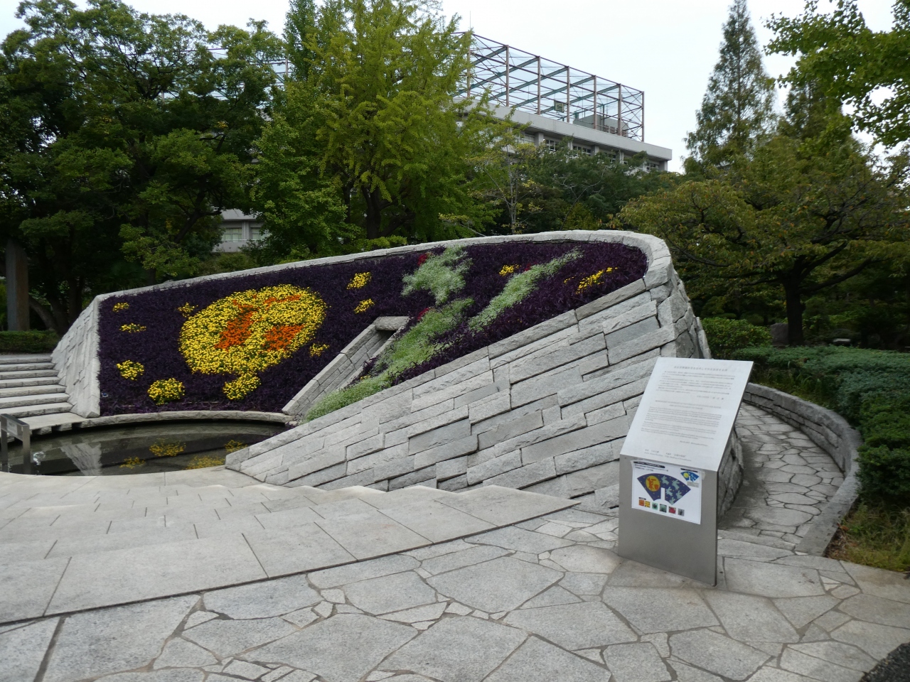 水を張った池の後ろの楕円形のモニュメントは緑化されていて紫・黄・緑・橙の花々が咲き誇っていました。
