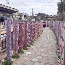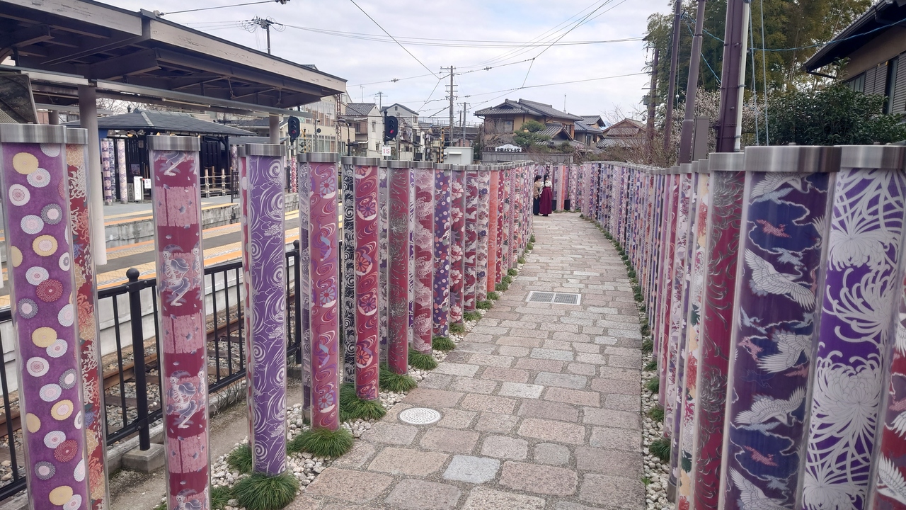 嵐山に来たときにKIMONO FORESTに行きました。ここは、嵐電嵐山駅のすぐ横にある撮影スポットで、「友禅」を用いたポールが約600本あります。このとき行った時期は2月の日曜日の昼頃でしたが、寒い時期にも関わらず、多くの観光客が訪れていました。