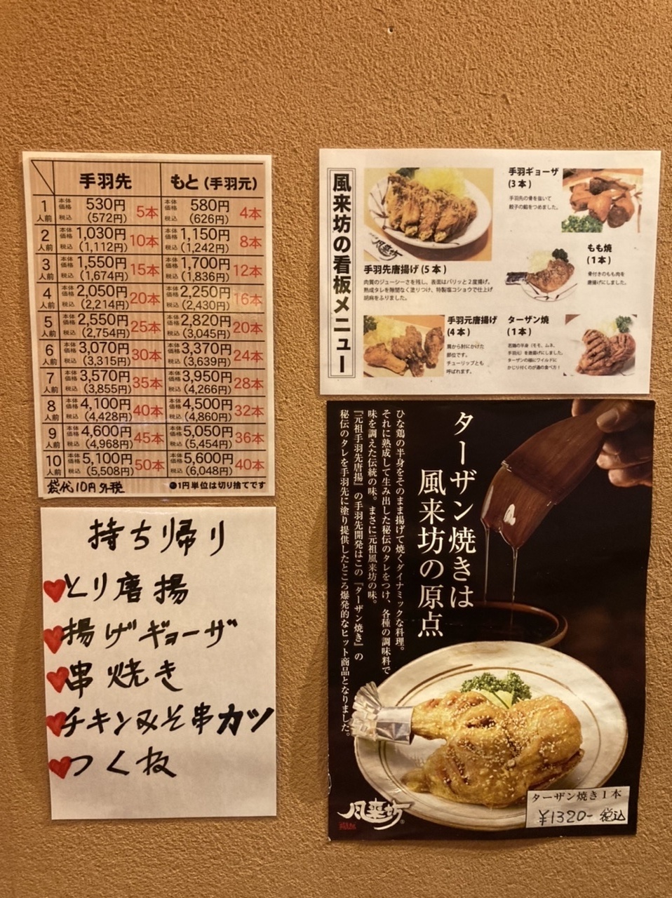 店の中には、手羽先ともと(手羽元)の価格表が数本単位で書かれたものがありました。