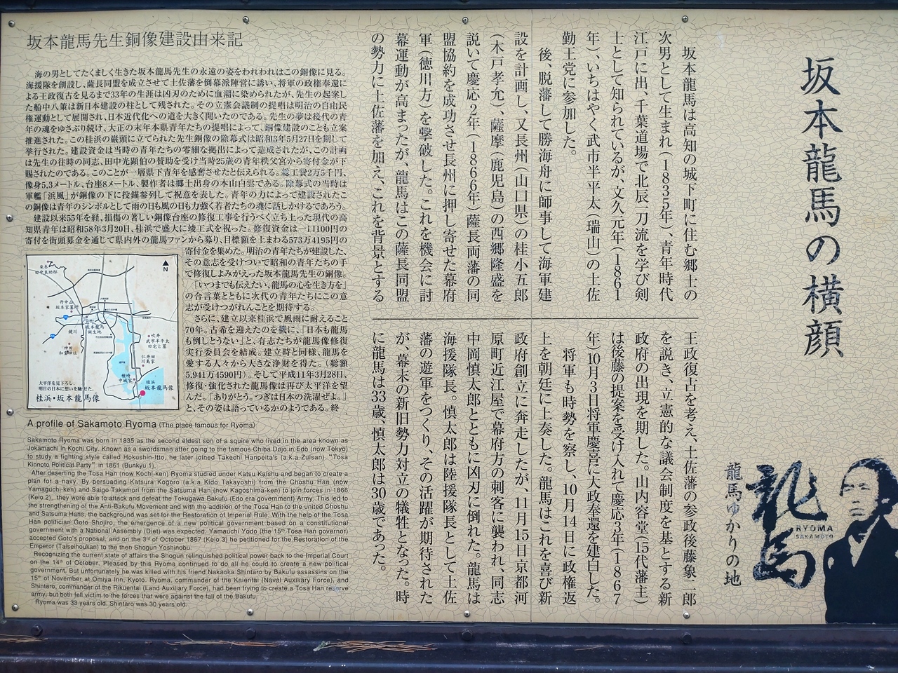 映像では何度か見たことのある龍馬像ですが、実際に現地で見て驚きました。こんなに大きいとは。銅像そのものも大きいですが、台座の高いこと。下から見上げる感じになるので、写真にすると小さく見えてしまいます。