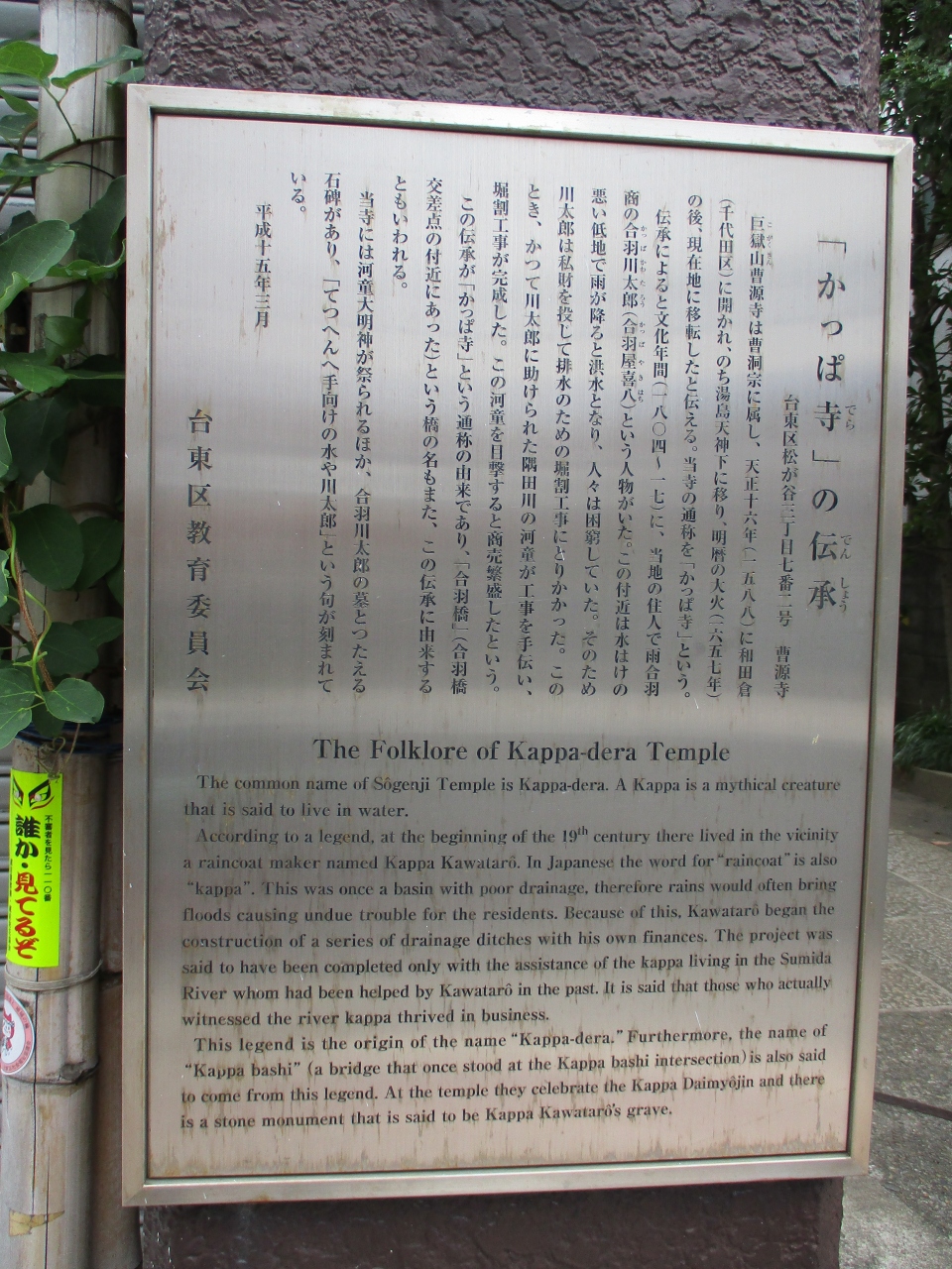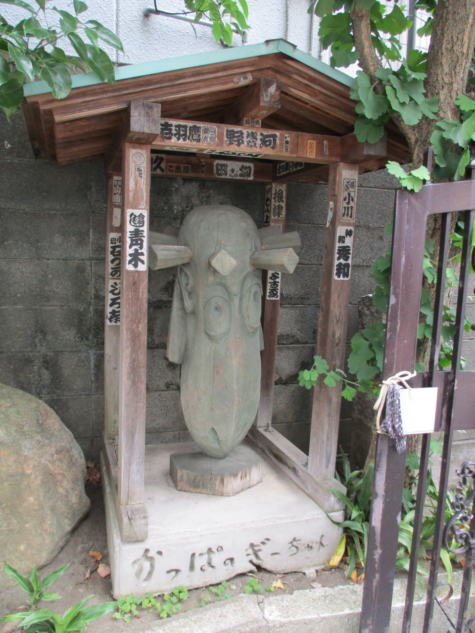 合羽橋道具街に近いところにある、通称かっぱ寺と呼ばれている曹洞宗のお寺に参詣に行きました。門柱に由来書きがあって、境内に入ると波乗福河童太郎大明神の赤い幟旗が目につきました。お社に上がる階段の下には河童の石像も置かれていました。
