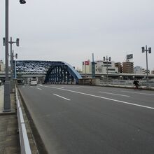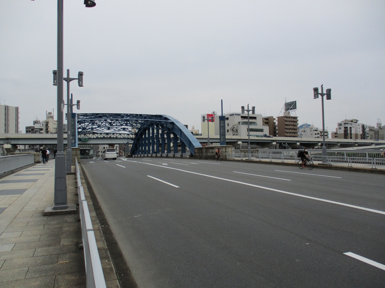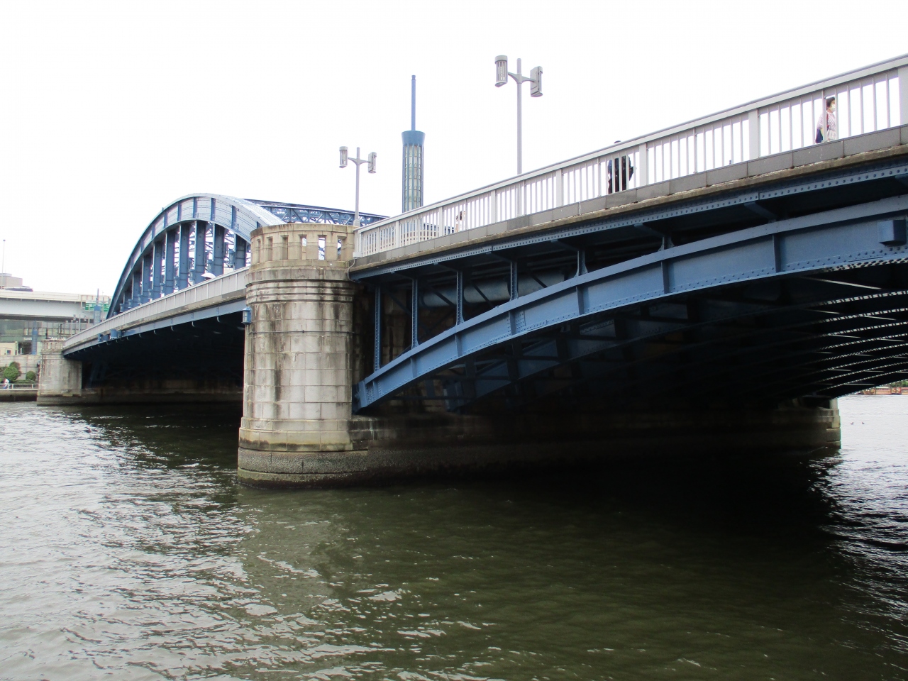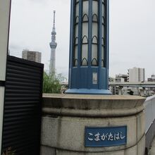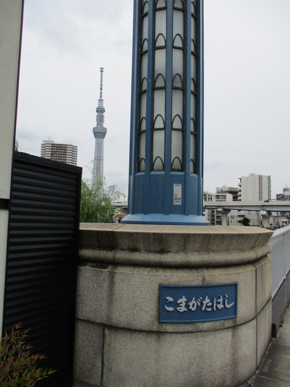 浅草近辺を散歩している途中で、隅田川に架かっている駒形橋を渡りました。アーチ型でブルーのしっかりとした造りの橋でした。橋柱は大理石でできていて、細長い独特の照明器具と遠くに見えるスカイツリーのコントラストが素敵でした。