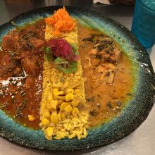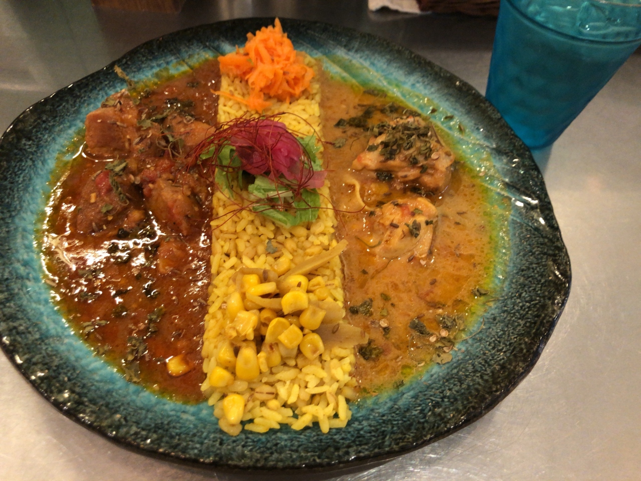 有楽町駅から徒歩6分ほど。カウンター9席テーブル1つのこじんまりしたお店ですが、女性一人客でも入り易くて安心です。私以外にも女性一人客多し。2種盛りカレ-980円ライスは大中小あり。レモンチキンカレー(マイルド)と日替わりのトマトと豚のカレー(中辛)でした。レモンチキンは肉がスプーンで切れるほど柔らかくレモンが爽やかで食べやすく美味しい。トマトと豚はこちらもお肉が柔らかくてスパイシーな味。私には少し辛いと感じました。ライスは日本米+麦飯のターメリックライス。コーンのサブジ、にんじんのサブジ、漬物、糸唐辛子がトッピング。真ん中にライスの土手を作り左右にカレーが配置されます。混ざらないように気をつけながら食べました。とても美味しかったのでまた行きたいです。