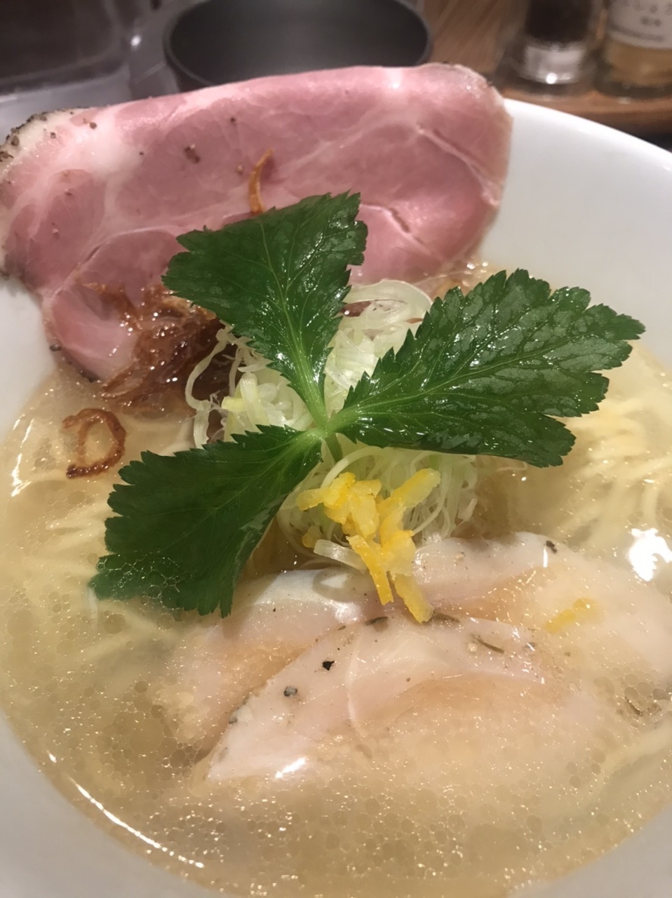吹田市の江坂にあるラーメン店です。黒醤油、白醤油、味噌ラーメン、ソーキそばに、それぞれスペシャルがあります。白醤油ラーメン800円を注文。昆布と煮干しから取ったスープで、一見塩ラーメンみたいです。あっさりした上品なスープは美味しいです。チャーシューは2種類、鶏と豚のレアチャーシューで美味しいです。替え玉は150円です。店はおしゃれで綺麗です。カウンターのみ10席ほど。駐車場はありません。