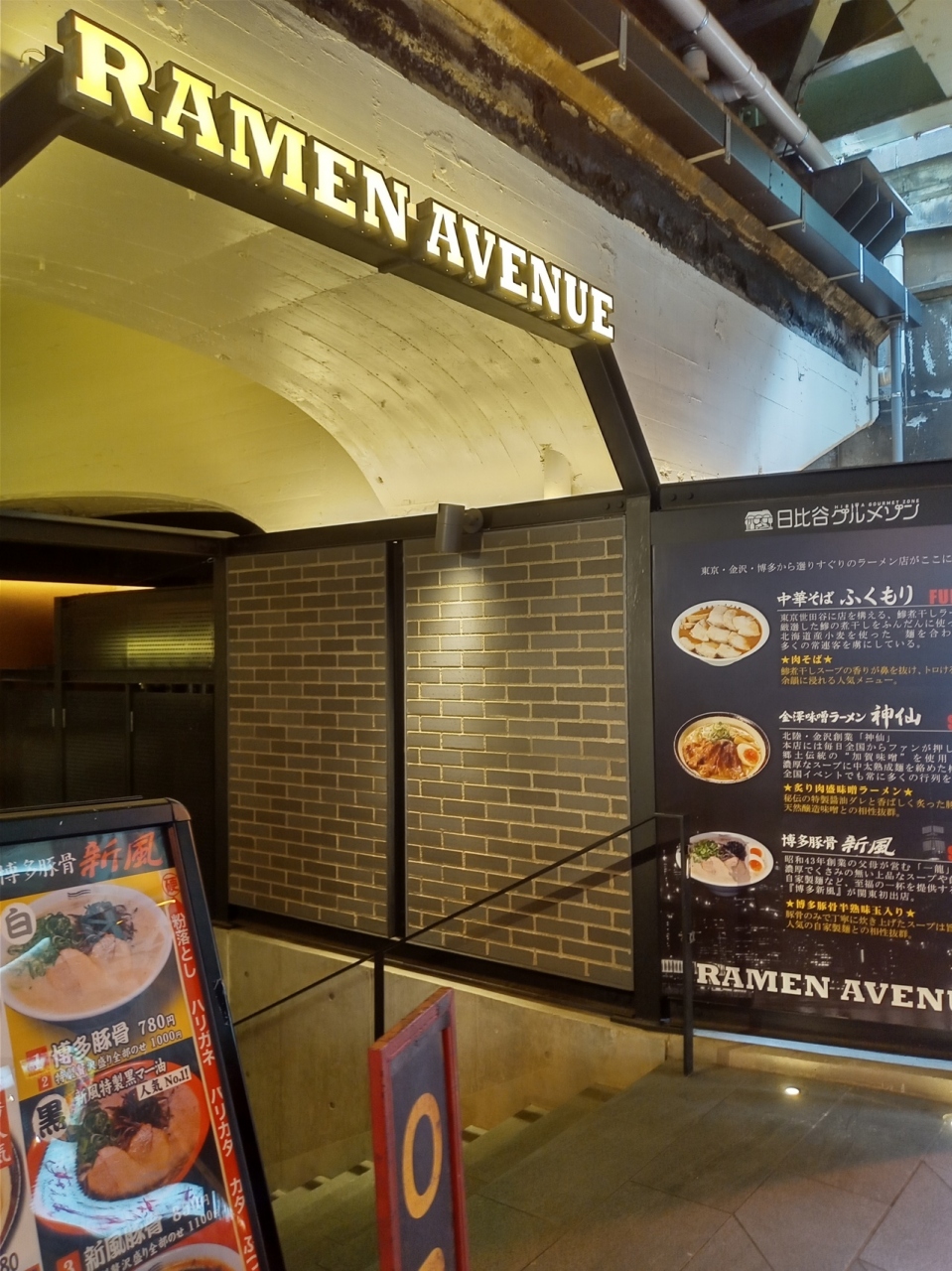 日比谷の高架下が綺麗に整備され、入口に「ラーメンアベニュー」があります。ラーメン店が3店舗出店していて、そのうちのひとつが「博多新風 ラーメンアベニュー店」となっています。本場博多の豚骨ラーメンが味わえるお店です。