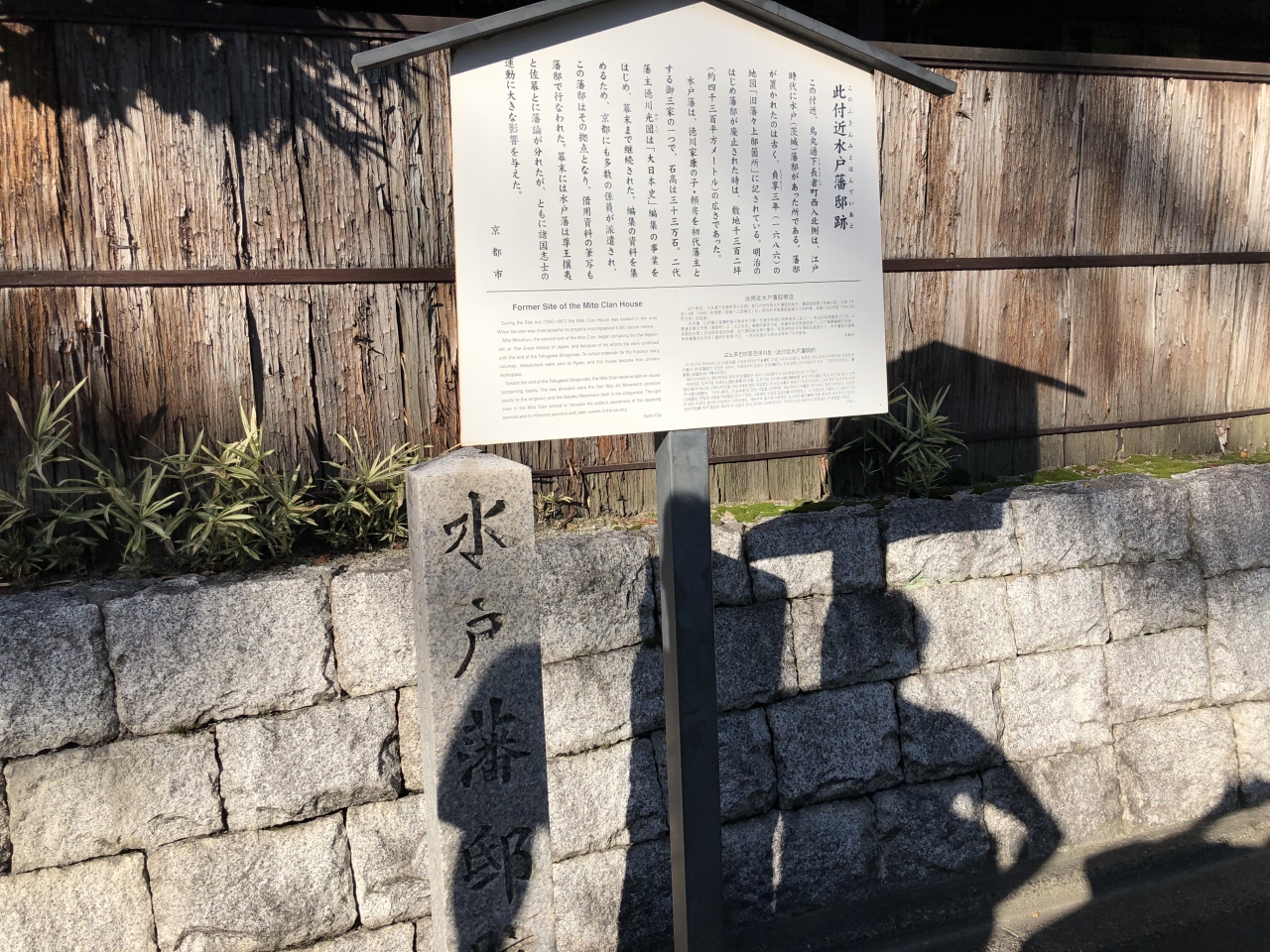 京都御所の西、烏丸通りを挟んで京都ガーデンパレスホテルの南側に水戸藩邸跡の石碑と駒札が立っています。江戸時代に水戸藩邸があった所のようです。「大日本史」編集の事業をはじめ、資料を集めるため、京都にも多数の係員が派遣されたそうです。京都御所周辺を街歩きしてたまたま見つけました。