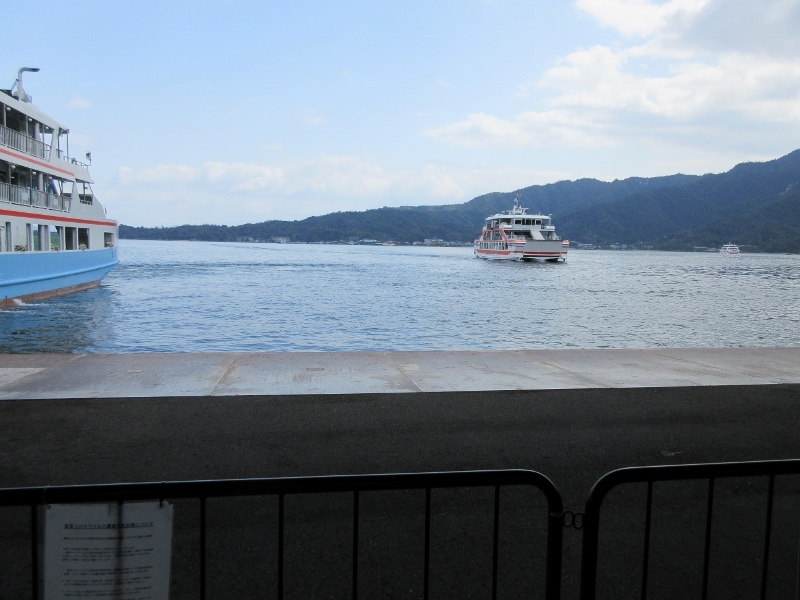 宮島口から宮島へは、JRの宮島フェリーと松大汽船の松大フェリーがあります。どちらも同じような感じです。ただ、宮島フェリーの方が大鳥居のそばを通るので、大鳥居の写真をそばで撮りたければこちらが良いけれど、この時は大鳥居が修理中で幕がかかっていました。