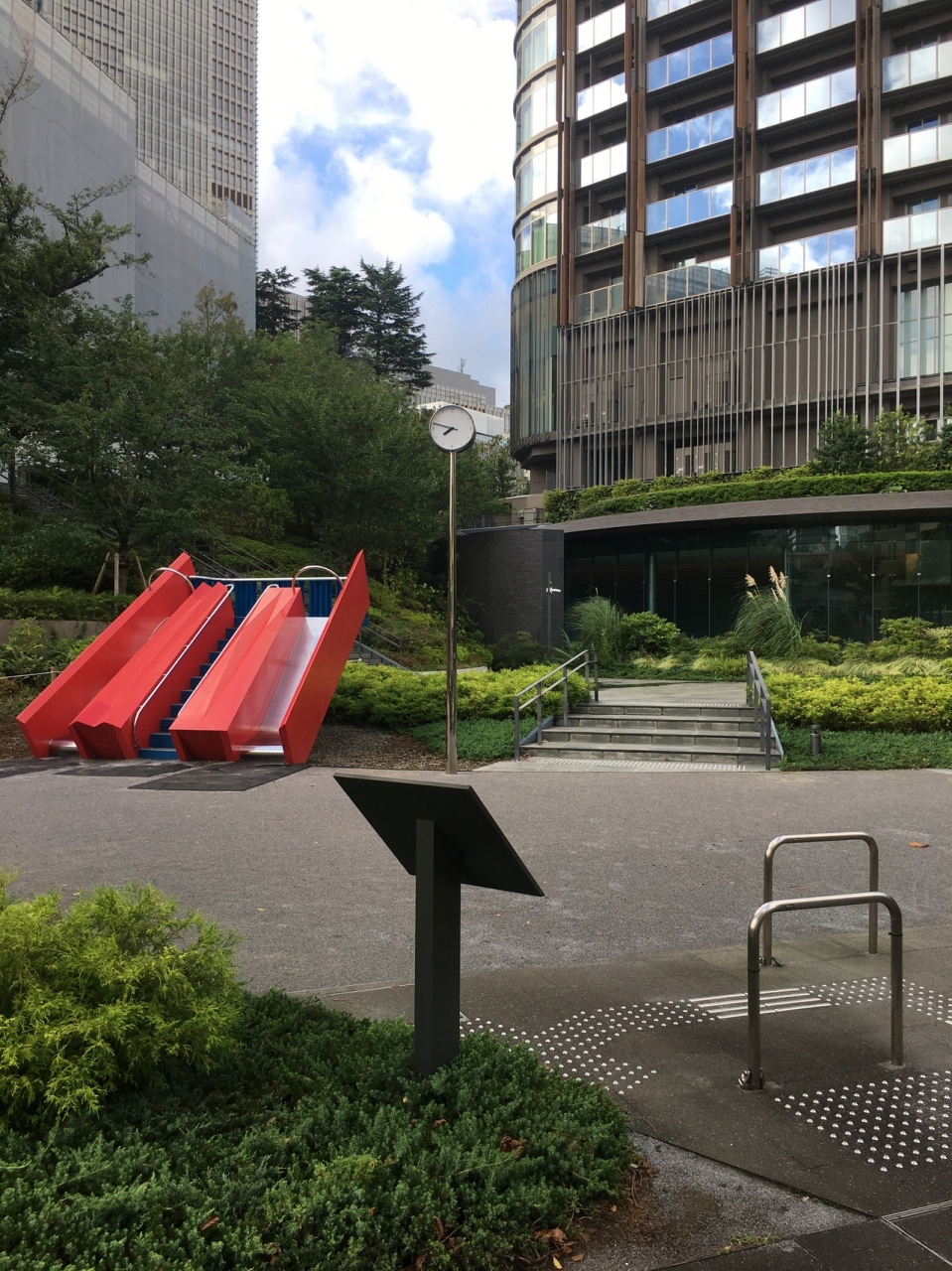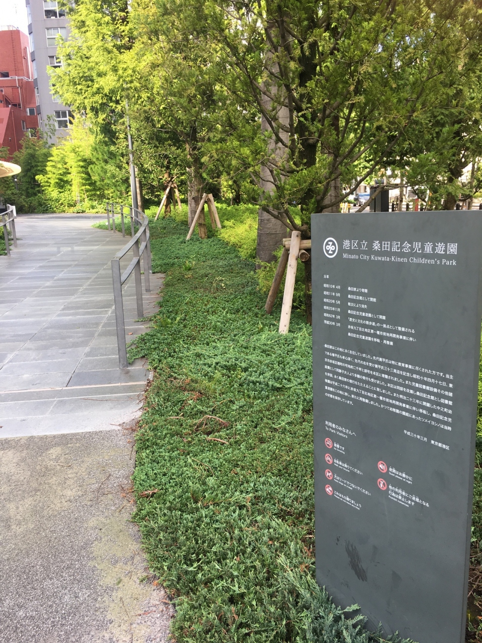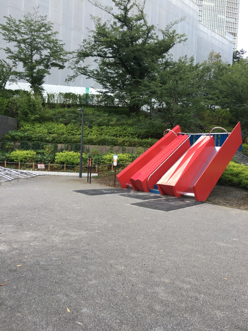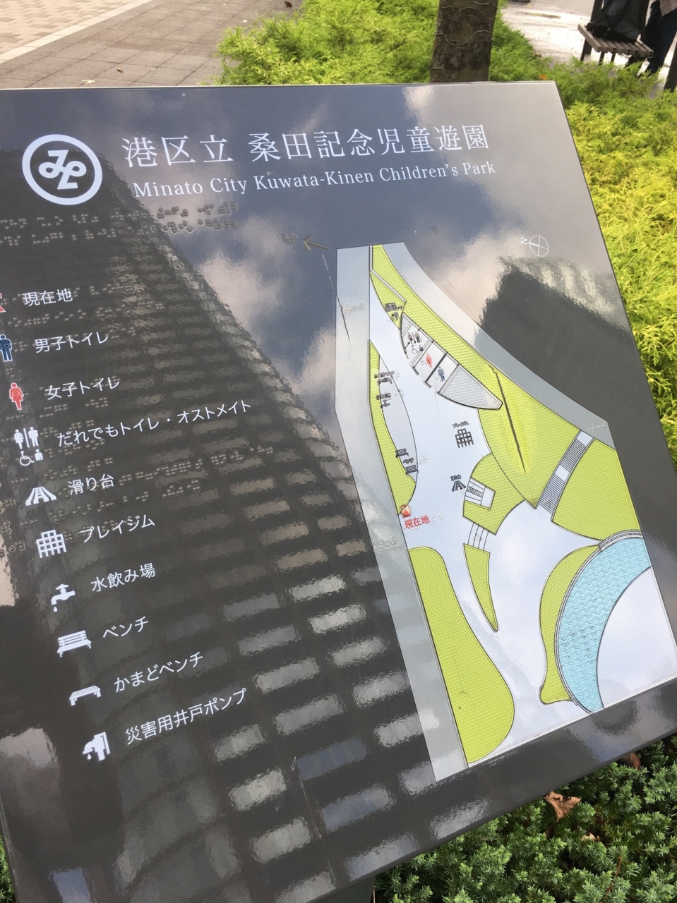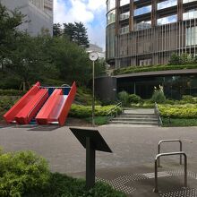 乃木坂の坂を下った道沿いにありました。小石と砂地のような地面で滑り台等子供の遊び場もあり、綺麗なトイレも完備していました。ベンチや水飲み場もあります。マンションが隣接していて、マンションのための公園に思えました。
