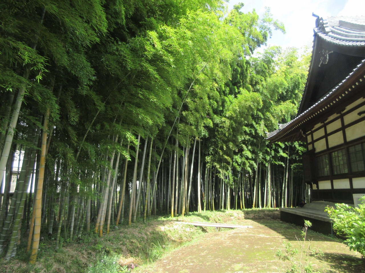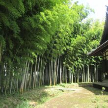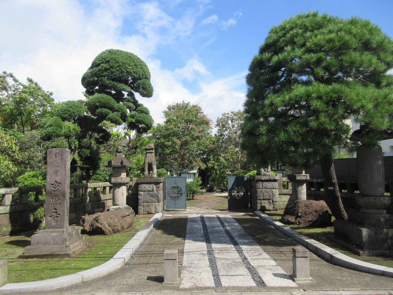 千歳烏山駅から20分ほどのところに造られている寺町を巡った際に立ち寄った日蓮宗の寺です。寺町通りに建つ存明寺横の路地を入って松葉通りに向かう途中に建っています。山門の柱には一対の大きな狛犬が建ち寺を守っています。境内は広く藤棚や枝垂れ桜、さるすべりなどが植えられ、山門から本堂に向かう参道には草木に囲まれていて緑豊かです。本堂奥には立派な竹林も造られていて、緑豊かな寺といった雰囲気があります。