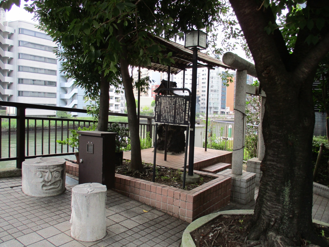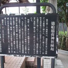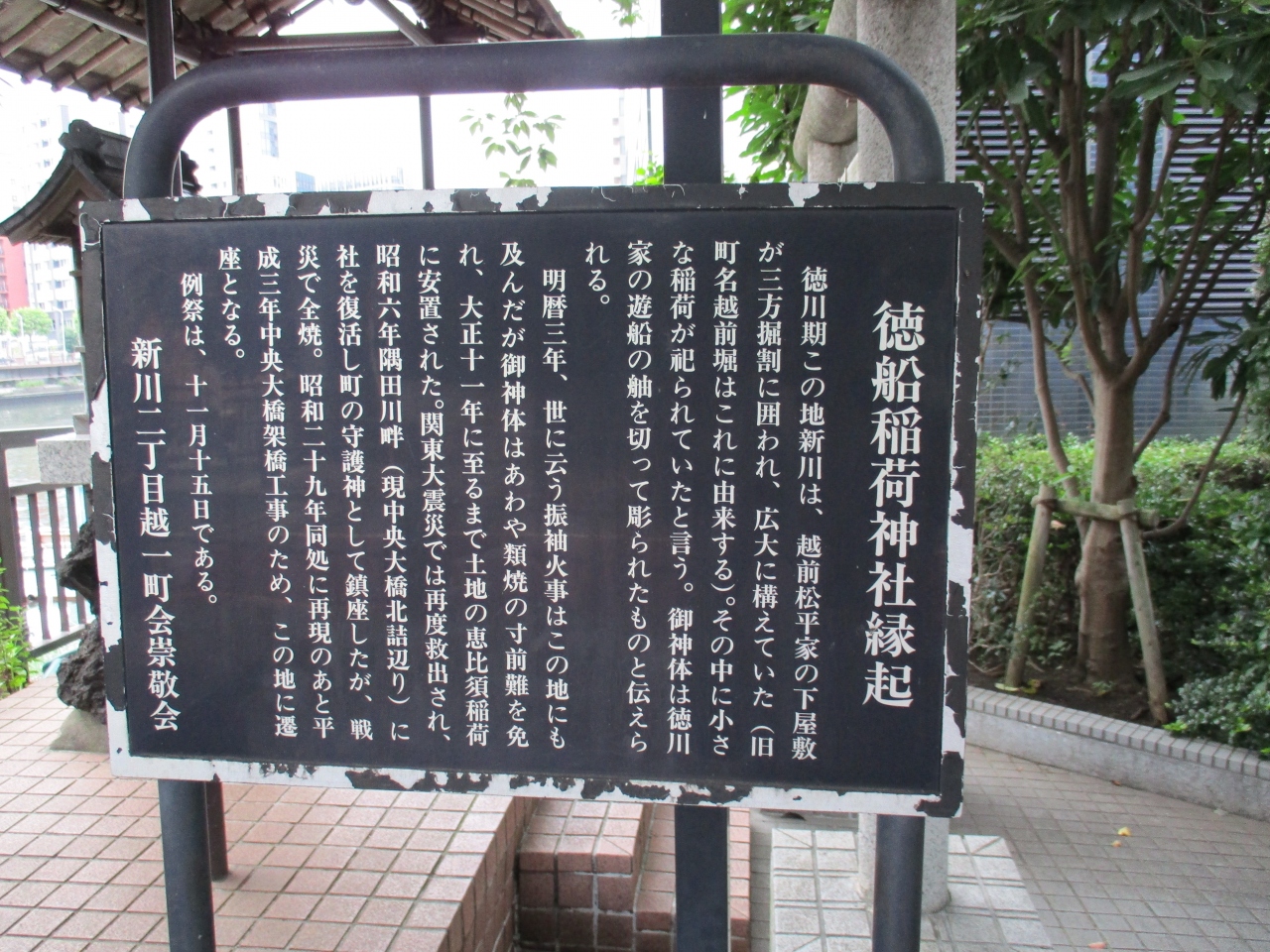 新川近辺を散歩中に、亀島川に架かる南高橋際に鳥居があるのに気が付いて立ち寄ってみました。とても小さなお社の稲荷神社で、江戸時代に徳川家の造船と関連があったので、名前が徳船稲荷となったようです。鳥居には町内の家内安全を祈願してなのか、お札を貼り付けてあったのが珍しかったです。