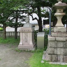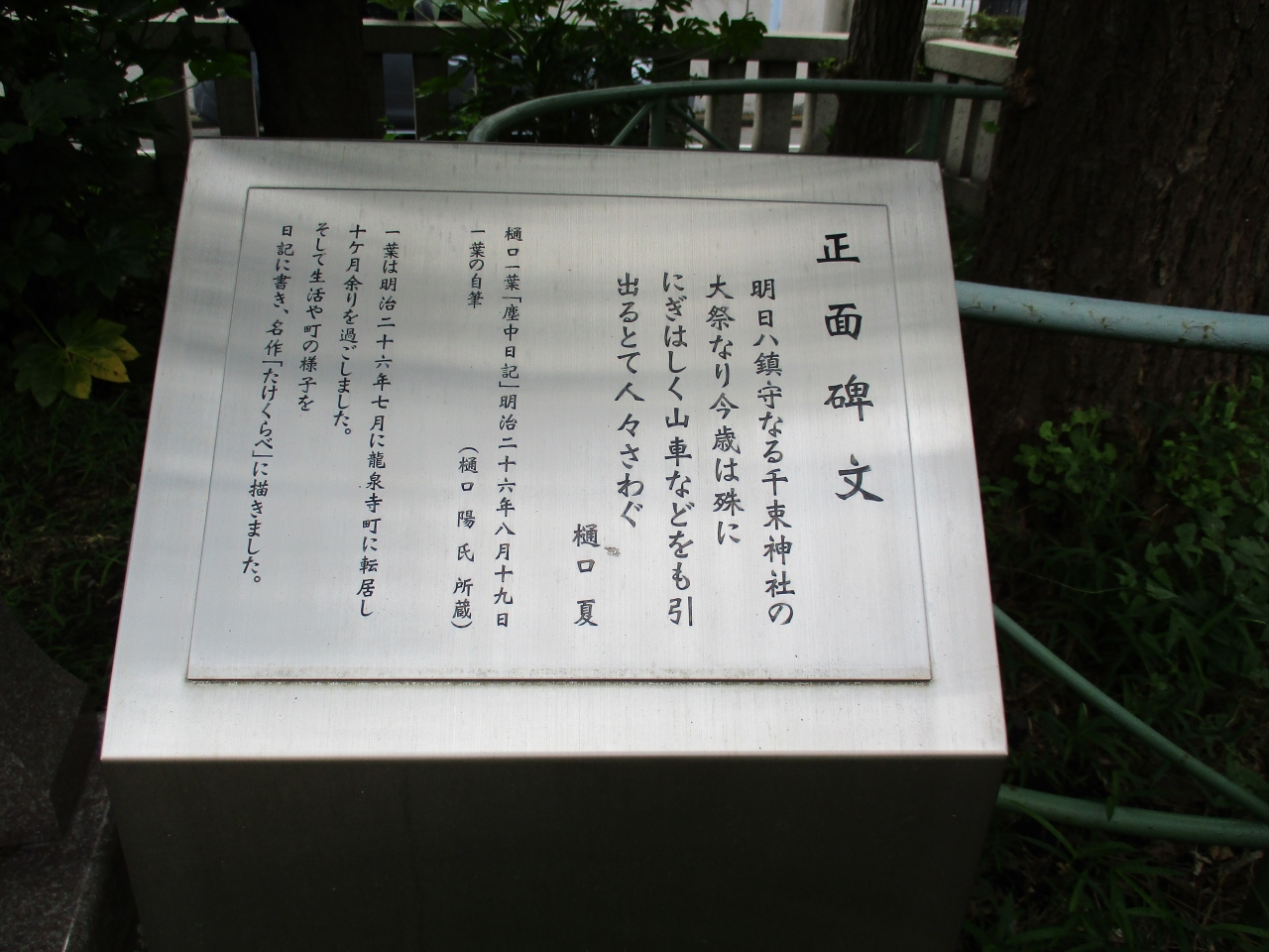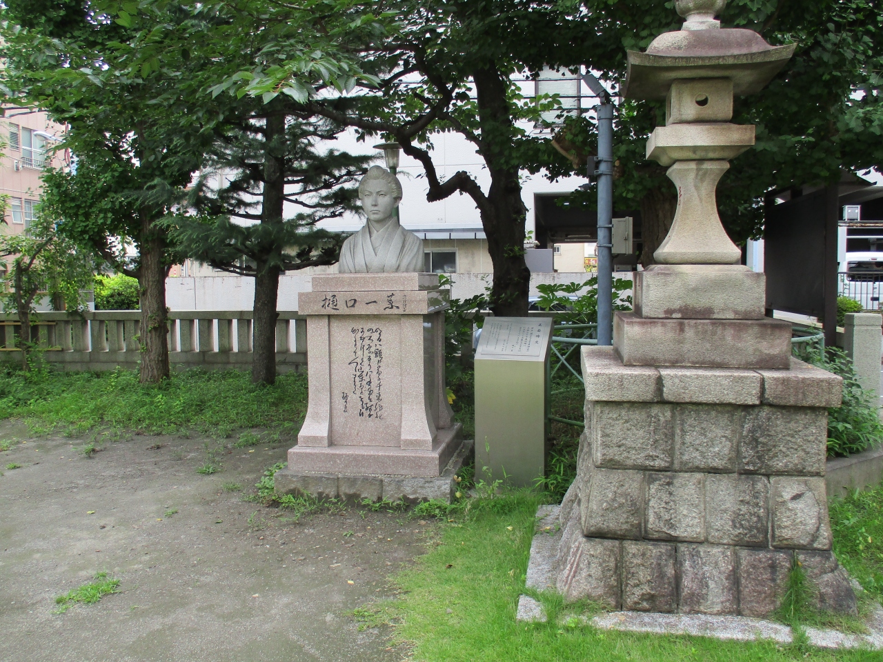 千束神社にお詣りした時に、若くして亡くなってしまった有名な文学者、樋口一葉がこの辺りを題材にした文章といっしょに肖像が建てられていました。この神社が作品にも出てくることから記念に建てられたと思います。肖像はいかにも聡明な顔立ちでした。
