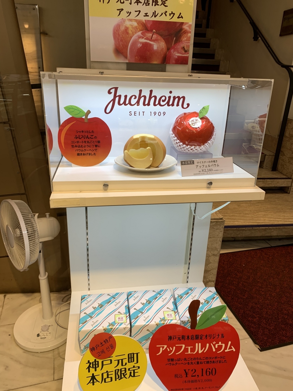 神戸元町商店街の1番街を入ってすぐ左手のユーハイムによく行きます。ガラス張りのエントランスの建物がユーハイム本店でシンボル的な存在です。本店でしか手に入らないアッフェルバウム目当てのお客さんもいます。神戸元町商店街は全長約1.2キロでおおよそ旧居留地大丸前駅からハーバーランド駅までです。