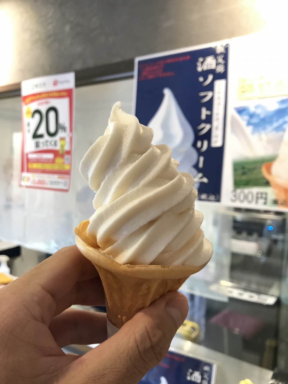秩父の街からは離れた高台にある「秩父錦」直営店。もちろん、「秩父錦」がいろいろと販売されていますが、注目は、お酒を使ったソフトクリームです。アルコール度数は低いと思いますが、それでもしっかりと日本酒の味がしていて、美味しいです。