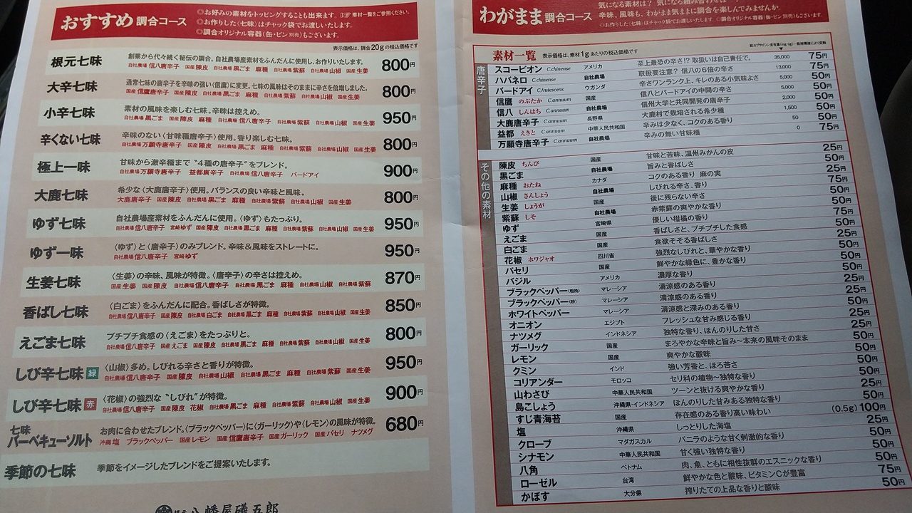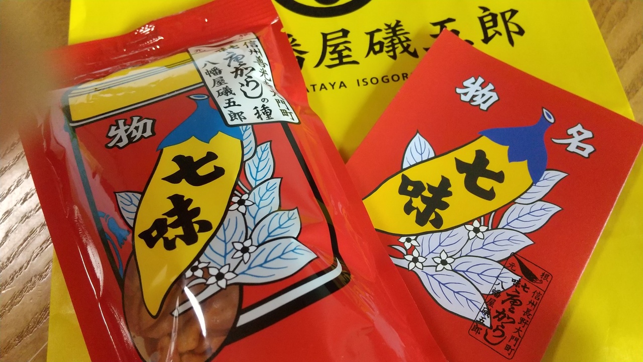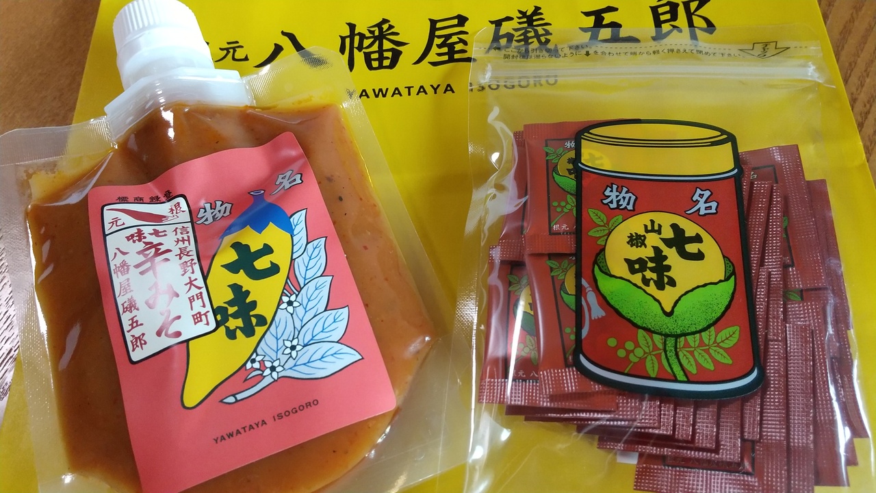 時間の都合でまたもオーダーできませんでしたが、七味を2種、辛味噌やお菓子、昨年大町の食事処で食べた、胡麻に七味がまぶしてある「七味ごま」を買いました。とても美味しく、ご飯や麺類、冷奴に掛けるのがお気に入り。