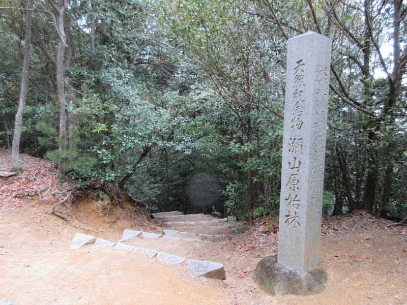 弥山は高い山ではないが、海抜400メートルからは針葉樹と広葉樹が混ざっていて珍しい原始林とのことです。厳島神社があり、島全体が大切にされてきたので手つかずのまま残されてきたのであろうと思いました。ロープウェイを降りて頂上へ向かう途中に、標識がありました。