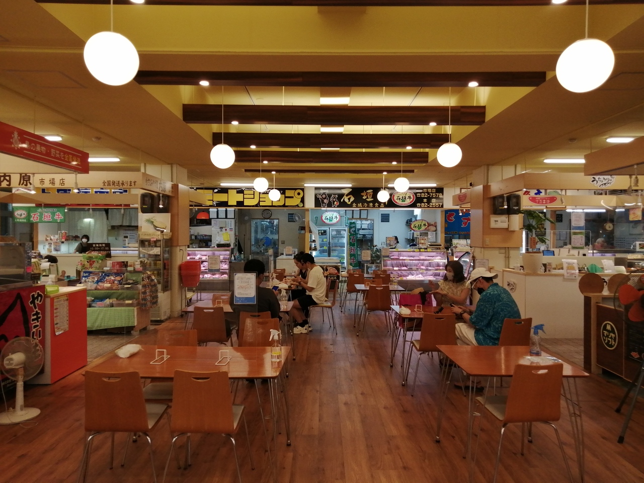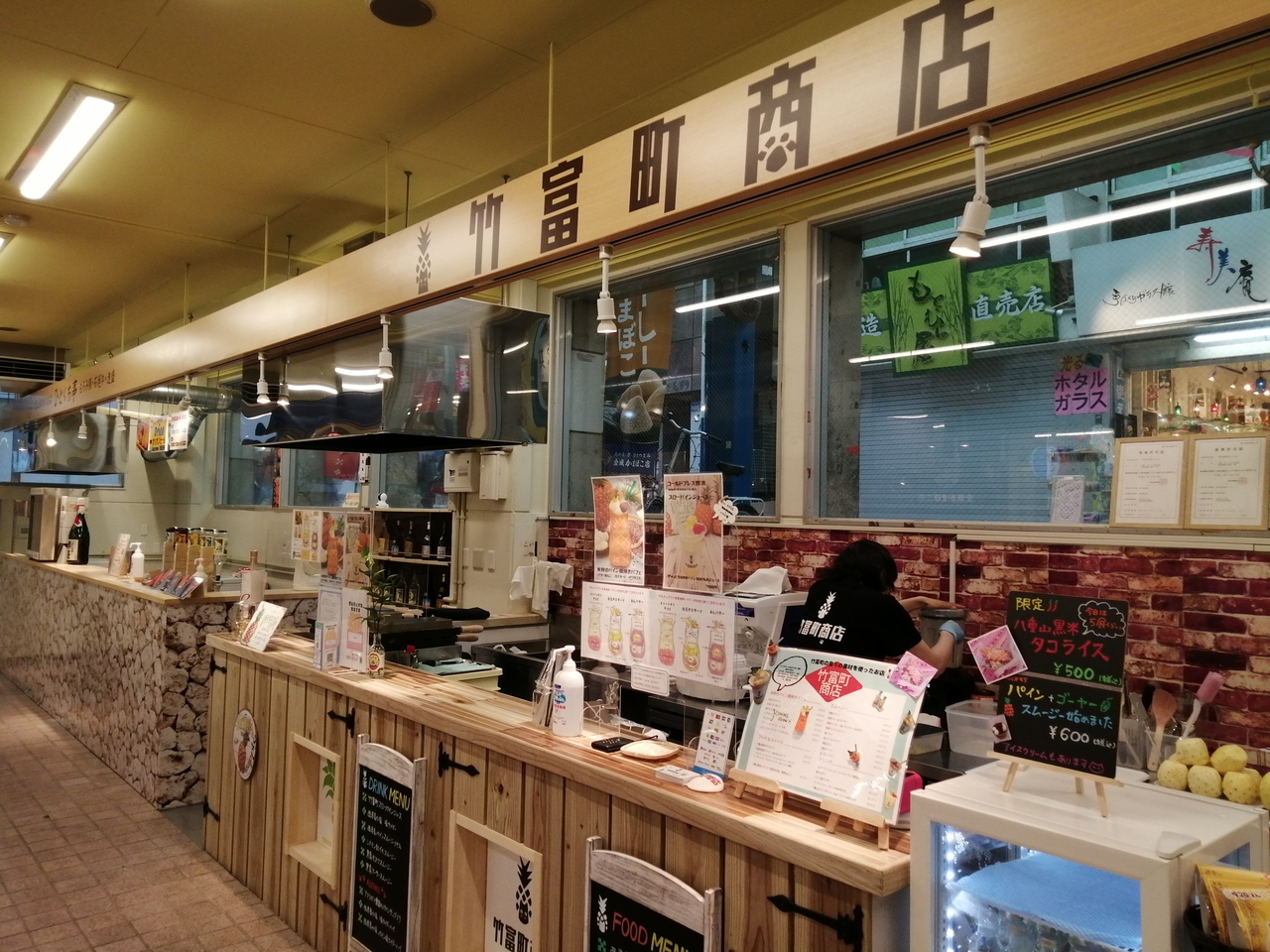 公設市場と聞くと庶民の台所、活気があり新鮮で安いものがずらりというイメージでしたが、たいぶ様子が違いました。観光客向けのおしゃれなスムージーだ、パフェだ、ハンバーガーだ、土産物だ…。もちろん観光客価格で値段が高い。ドン引きしました。もちろん昔はそうではなかったのでしょうが…。テナント不足、時代の流れというやつですかねぇ。唯一、“気を吐く”のが一画にある肉屋さんと魚屋さん。こういう店をみると安心します。お刺身だって島価格ですから。