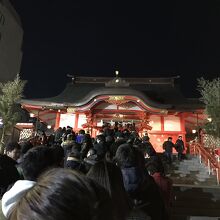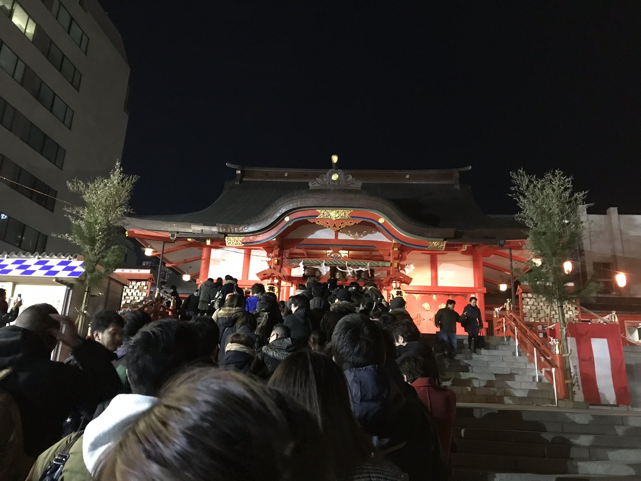 初詣にと1/3の夜に訪れてみると、まぁまぁ、そこそこ並んでいる程度で、お参りできたので良かったです。だいたい5分ぐらいの列でした。正月の雰囲気も味わいつつ、帰りに、友人と居酒屋で乾杯もできますし、結構オススメです。