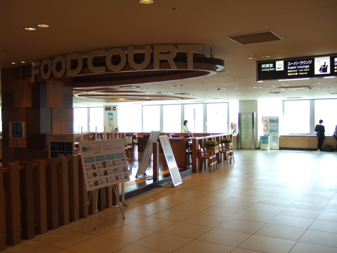 新千歳空港国内線ターミナルの3階にあるフードコート。ラーメンからハンバーガー、ジンギスカンといろいろなお店が入っています。客席数も多くて開放的な雰囲気ですが、朝早くから営業してるので、早い便で出発する時にも助かります。