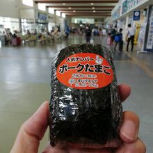 石垣島離島ターミナルに入っているコンビニ商店の1つです。どの店も店先にはお弁当やおにぎり、店内にはお土産やジュースなど。どこもあまり大差はなさそうなので、この瀬戸商店で「ポークたまご」を買ってみました。焼きスパムとたまご焼きを挟んだ沖縄名物のおにぎりです。1個250円。