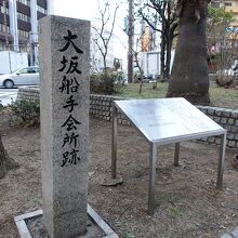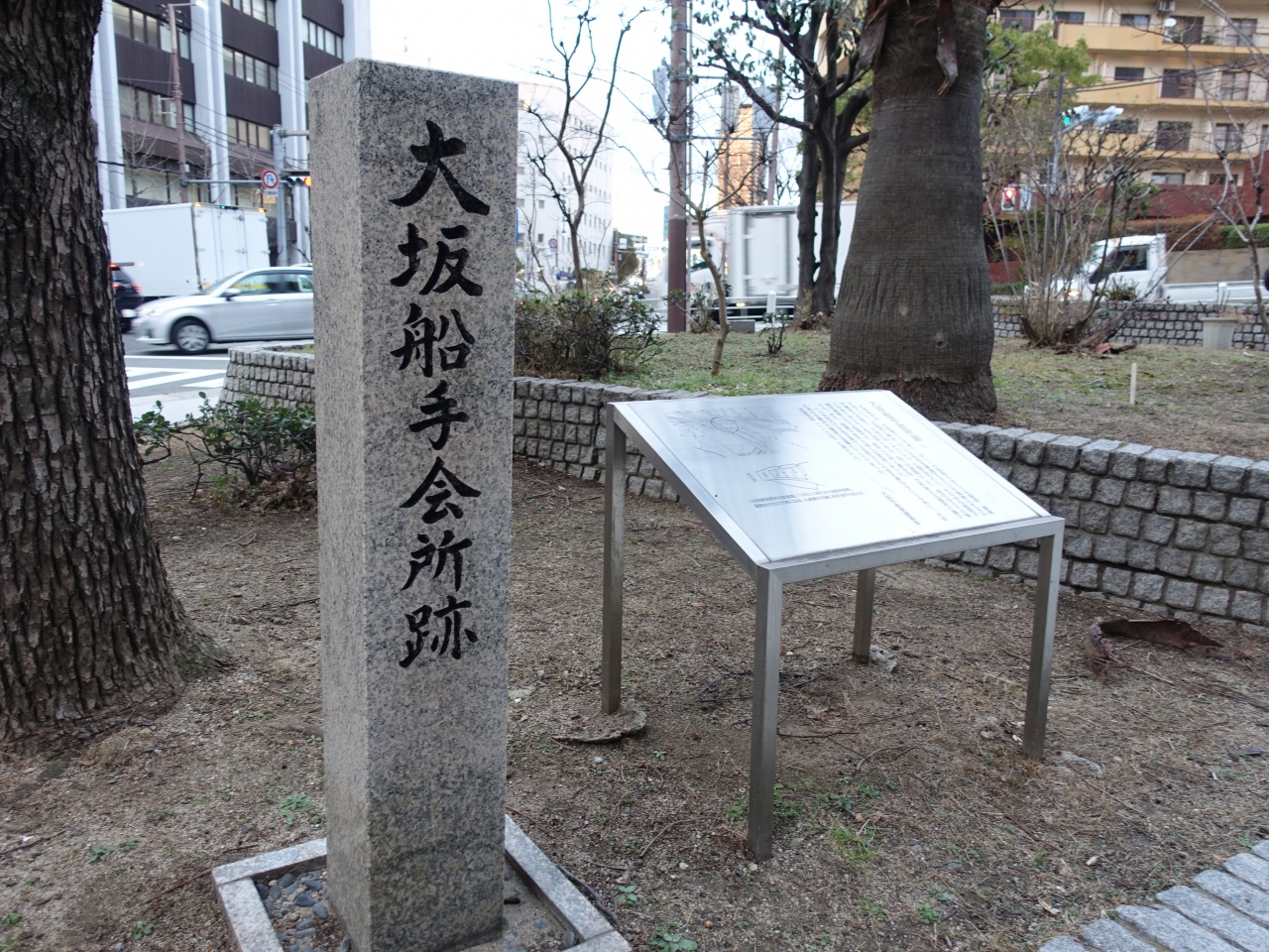 大阪市西区、本町通りを西に進み、木津川橋を渡って最初の信号機の近くに「大坂船手会所跡」の石碑があります。「大坂船手」は、江戸幕府から船舶の出入りの管理を任されていた役所で、その跡地を記す史跡のようです。石柱とステンレス製の案内板がありますが、往時を偲ばせるイラストのようなものあればさらに良かったと思いました。