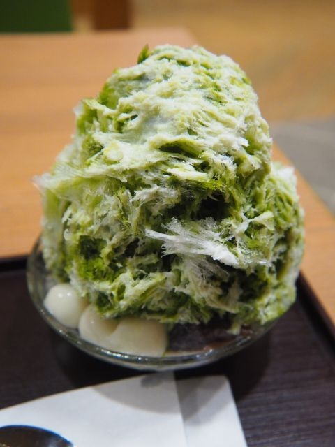 かき氷に、抹茶と練乳クリームをたっぷり掛け、白玉と小豆を添えている。