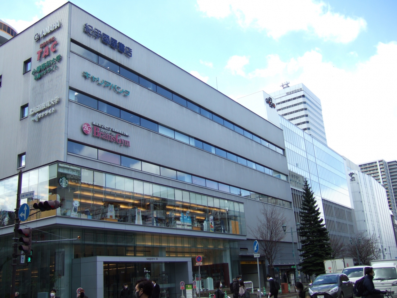 2つの建物があり、手前は大きな紀伊国屋書店が入っているビル、奥は駐車場の上に飲食店が入っています。紀伊国屋は札幌市内でも大きな書店で、書籍が良く揃っています。