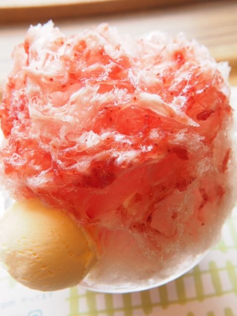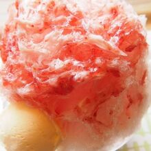 かき氷に練乳と苺ソースを掛け、アイスクリームを添えたもの。