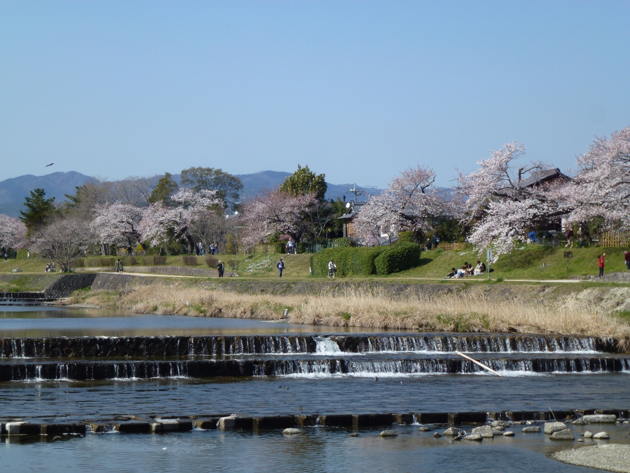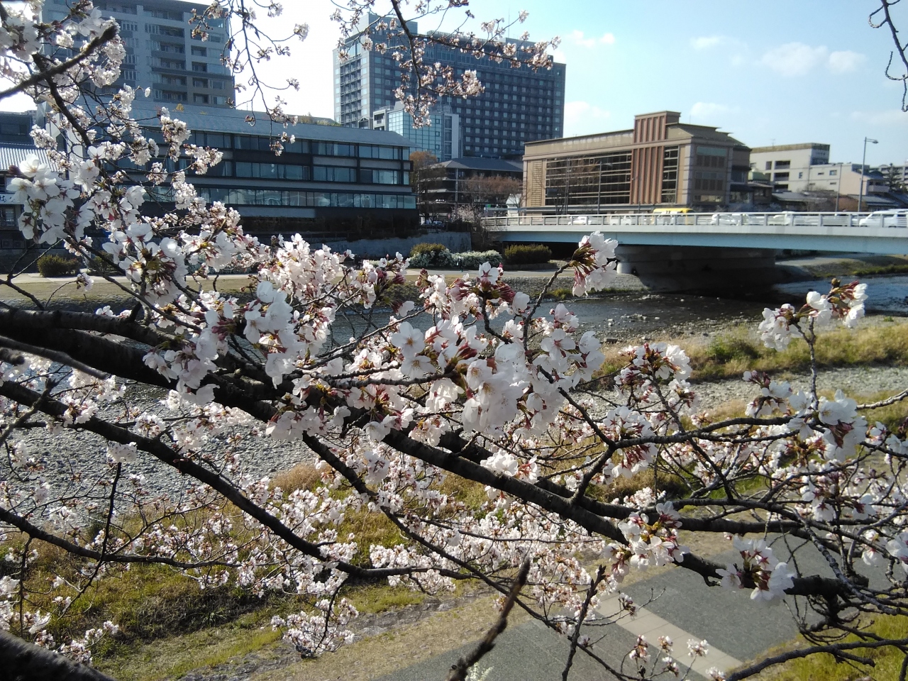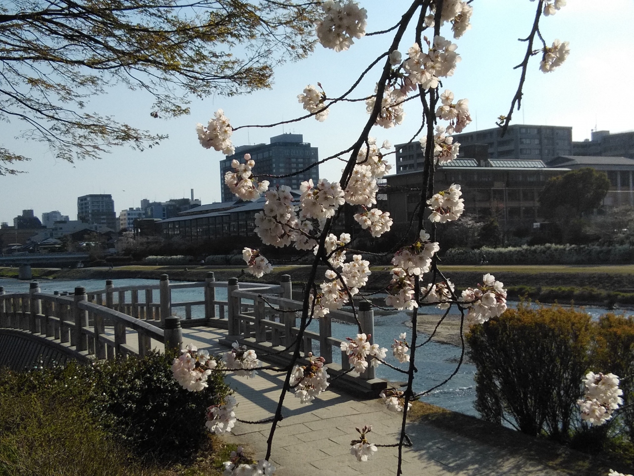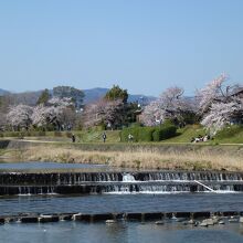 鴨川は、桟敷ケ岳付近を源として桂川の合流点に至るまで京都市内の南北を流れる約23kmの河川です。鴨川は護岸がきれいに整備されているので、ジョギングや散歩する人とよく見かけます。また若者カップルの憩いのスポットにもよく利用されている場所です。樹齢の進んだ桜の大木もあり、4月にはみごとな花を咲かせてくれます。