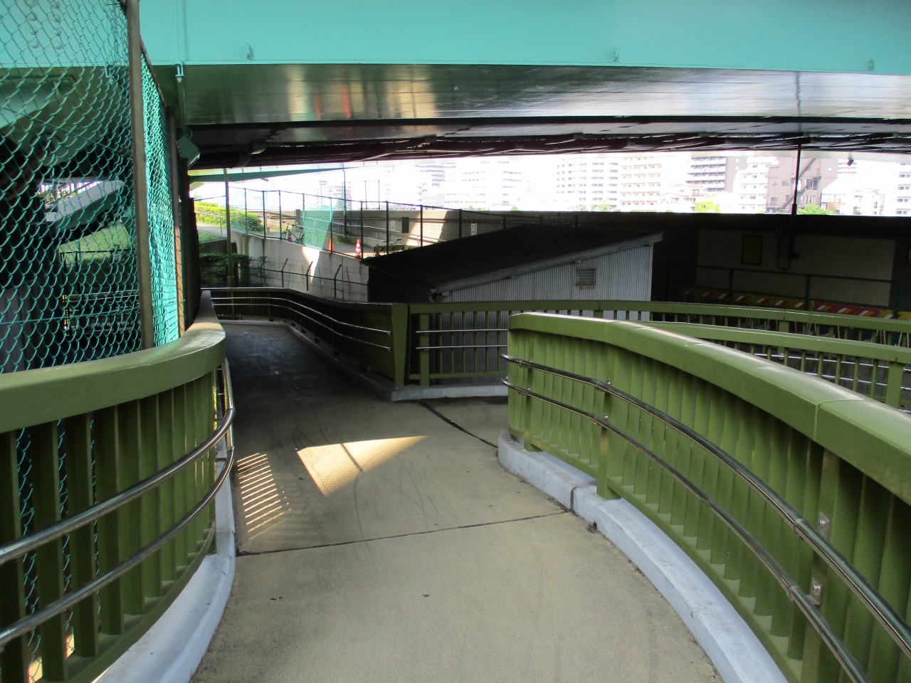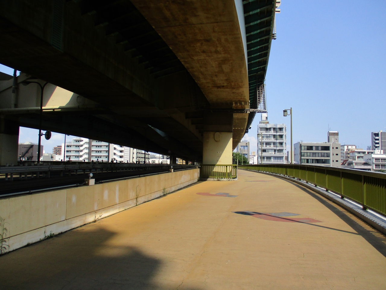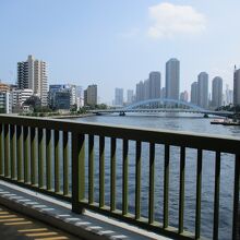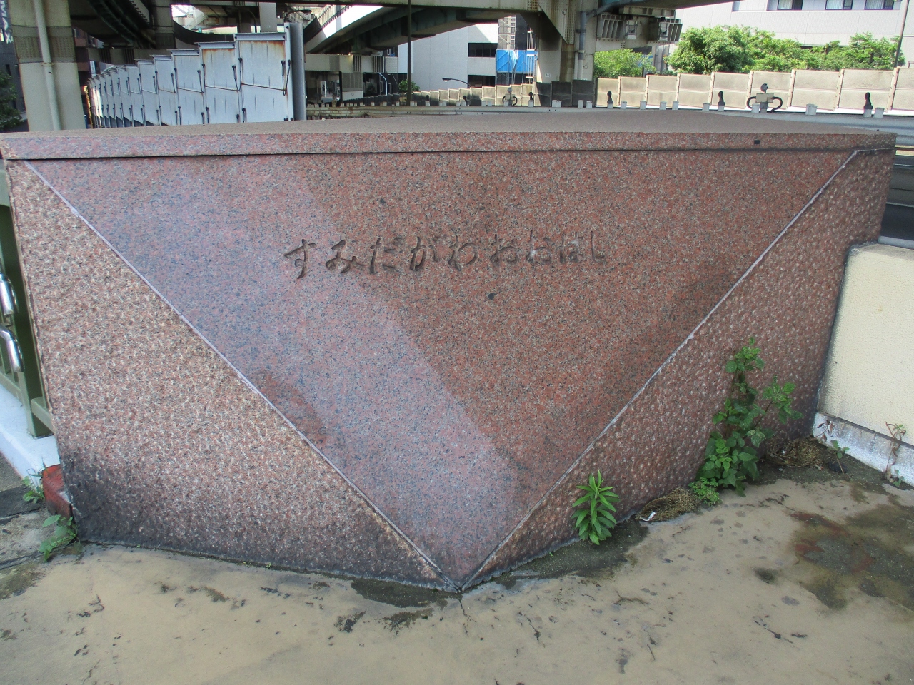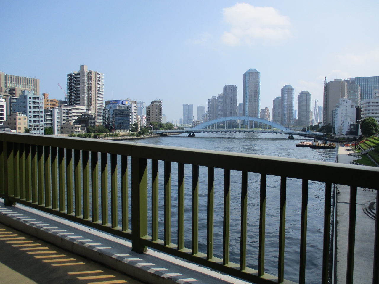 箱崎界隈を散歩していて、隅田川に架けられている隅田川大橋を渡りました。首都高速道路が通っているので、橋に上がる歩道が回り込みながら橋の上に出るようになっていて、ちょっと戸惑いました。橋の下流方向には永代橋がとても良く見ることができました。