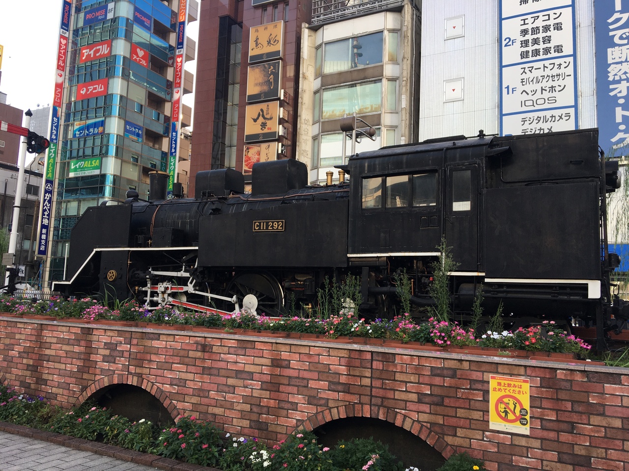 JR新橋駅日比谷口を出ると目の前が広場になっており、蒸気機関車が鎮座しています。よくテレビで新橋のサラリーマンがインタビューされているのがこの広場です。広場の近くには、ヤマダ電機やニュー新橋ビルがあり賑やかです。