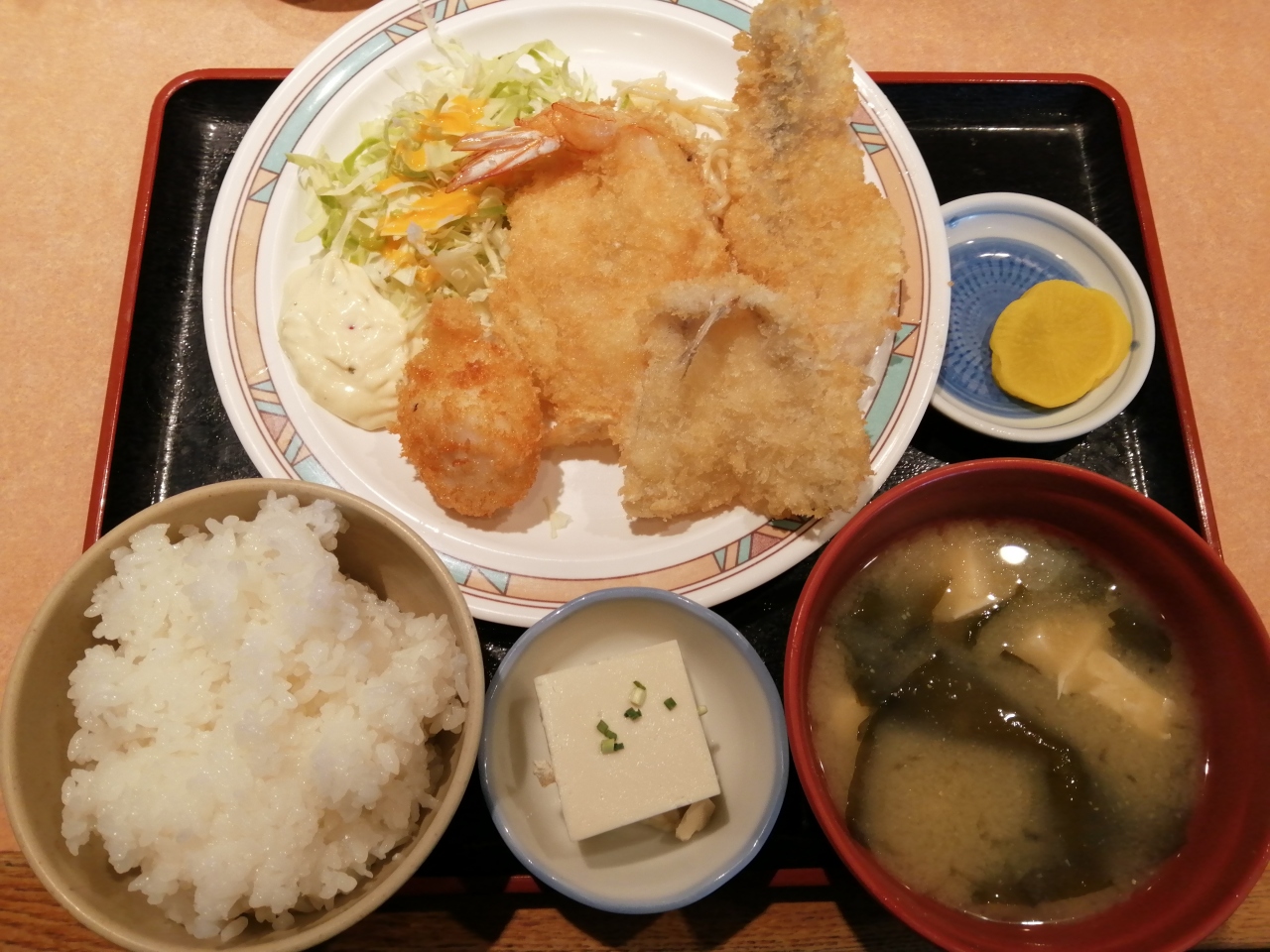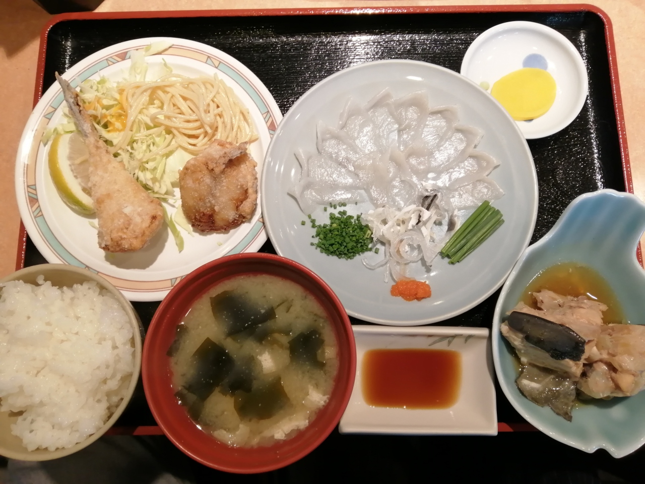 ふくふく定食2000円はふぐの唐揚げとふぐ刺しつきで、ミックスフライ定食1300円はホタテ・アマダイ・キス・エビのフライでした。