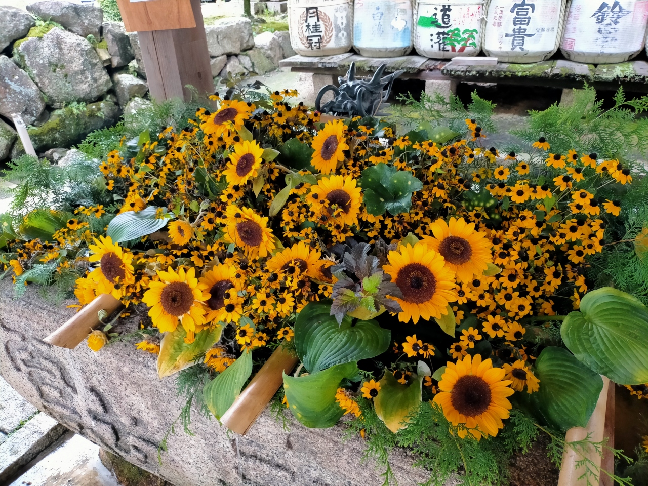また入口のある手水舎は夏バージョンでひまわりとルドベキアが飾られた花手水になっていてきれいでした。