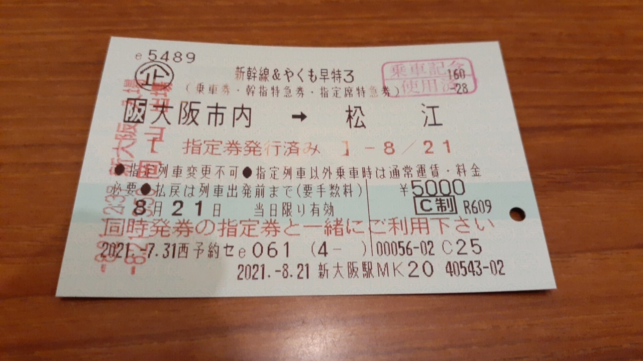 この切符、「e5489」というJR西日本の切符予約サイトで購入することができ、利用する日の3日前までに購入すると、新大阪又は新神戸~岡山間の新幹線と岡山~米子間の特急やくもの指定席が4,500円で、新大阪又は新神戸~岡山間の新幹線と岡山~松江又は出雲市間特急やくもの指定席の場合は5,000円で利用できるという内容です。