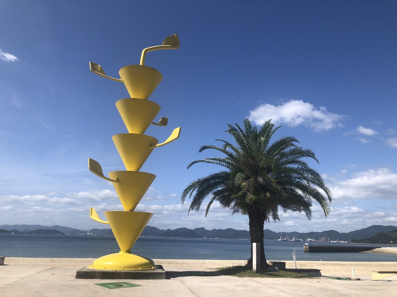 瀬戸田サンセットビートは、生口島にある長さ800mの美しい白い砂浜が広がるビーチです。日本の名海水浴場88選にも認定されているとのことです。9月にしまなみ海道をサイクリングした時に訪れました。生口島と高根島では、島まるごと美術館にしょうとのコンセプトで17作品のアートが設置されています。このサンセットビーチには、その内の5作品が設置されています。美しい白浜で一休みもgoodです。
