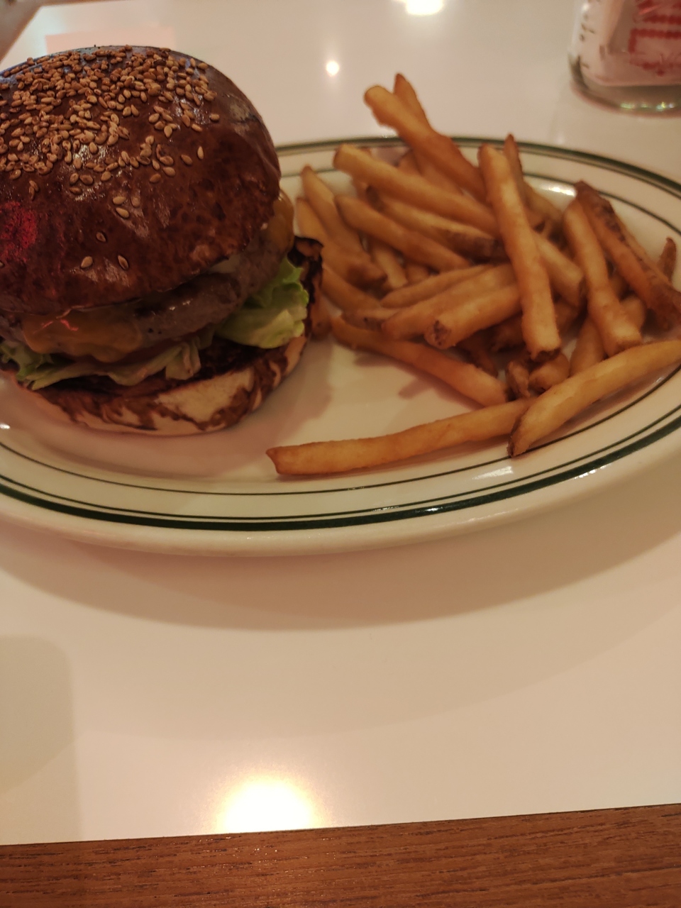 新宿駅東口直結の駅ビル内にあります。席はテーブル席のみです。バーガー系は、1500円前後です。ポテトがつきます。ポテトはサクサクして、味もしっかりついていました。一方チーズバーガーは、塩味が薄めなので、卓上のケチャップや塩で調整すると、ちょうど良くなりました。クレジットカードが使えます。