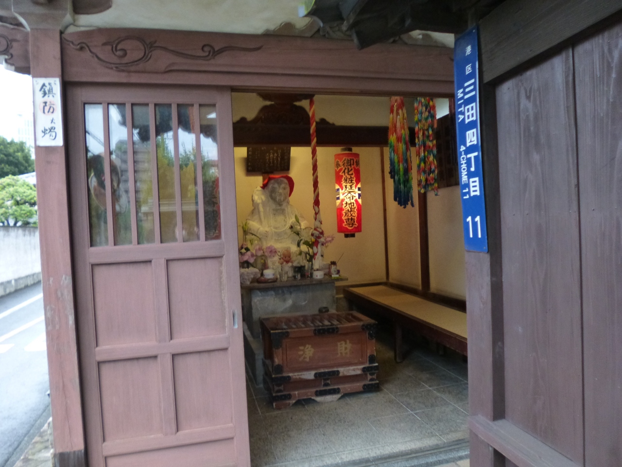 白銀高輪駅の東側、お寺の多い地区の中にあります。他のいくつかのお寺同様、1635年江戸城築城に伴う区画整理のために八丁堀から移転してきた曹洞宗のお寺です。山門の横にある地蔵堂にはおしろい地蔵と言われるお地蔵さんが安置されています。住職が橋畔に放置されていた泥にまみれたお地蔵さんを不憫に思い、白粉を塗って祀ったら、顔面の痣画が消えたということから、お肌に悩みのある方を中心にお詣りがされているようです。