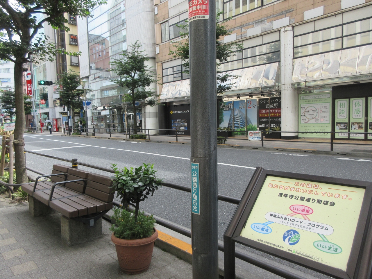 吉祥寺駅の北側を散策した際に吉祥寺通りを歩き、この通りの両側の吉祥寺公園通り商店会を見ました。JR線路から五日市街道までの通りはバス通りで訪れた休日午前の交通量は多く両側の歩道を歩く人も絶えませんでした。銀行、証券会社、百貨店、ホテル、飲食店、コンビニがありました。歩道に花が咲いているプランターがあり、木製ベンチが設置されていて座っている人がいました。吉祥寺公園通り商店会が歩道の清掃管理をしている案内板がありました。落ち着いた雰囲気の立派なベンチが印象的でした。
