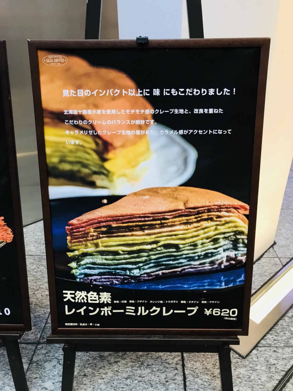 店頭には天然色素で色づけされているレインボーミルクレープの美味しそうな看板が。