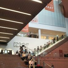 入るとすぐに高さ約30mの吹き抜けの開放的な空間が広がり中央に位置する大階段が劇場へと誘います。