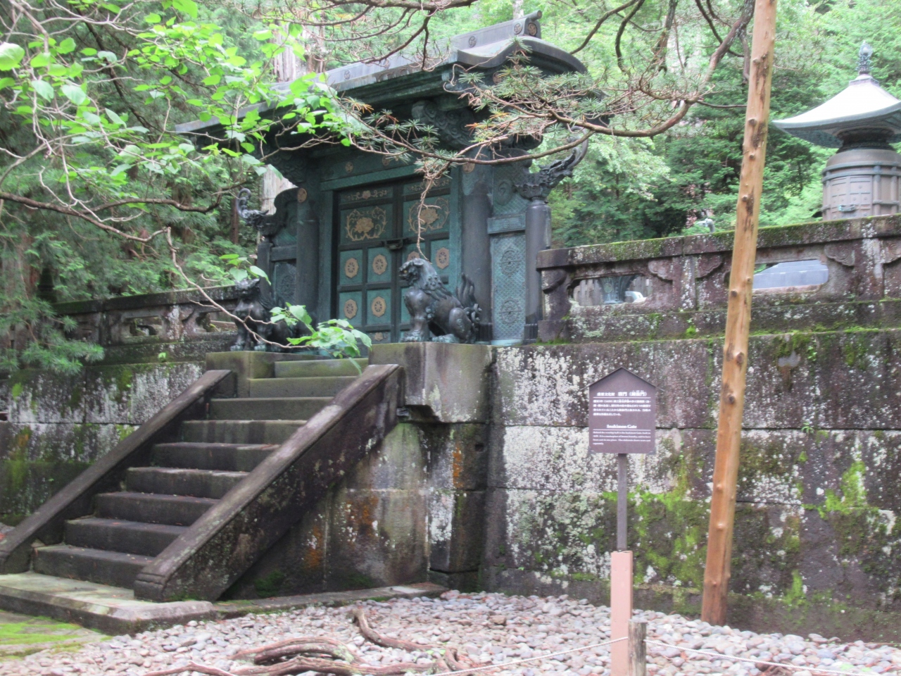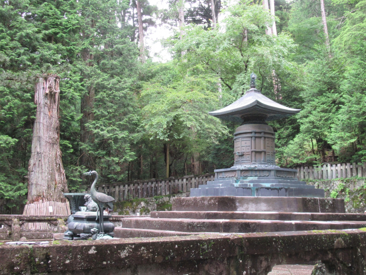 日光東照宮の豪華な陽明門をくぐって右手へ、有名な眠り猫が飾られている門をくぐって、森の中の長い石段をあがった先にあります。本殿の真裏にある奥宮は御祭神である徳川家康公の墓所だそうです。拝殿の裏手には御宝塔がありました。
