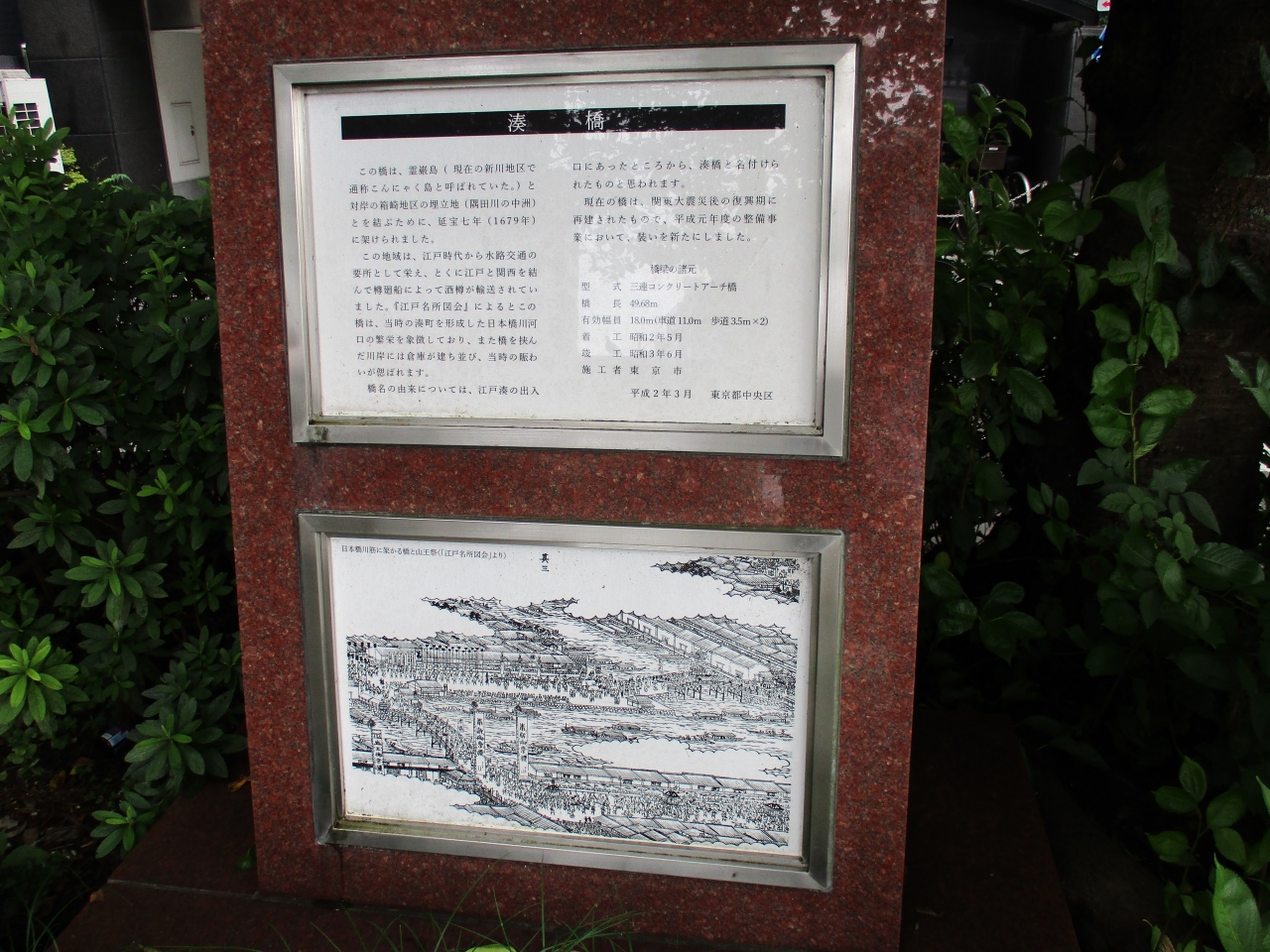 箱崎から新川方面に向かって散歩をしていた時に、日本橋川に架かっている湊橋を渡りました。この辺りには橋がたくさんあって、湊橋は特に目立たない普通の橋でした。昔は海上交通の要所で、港の役割があった場所なので名前がつけられたようです。