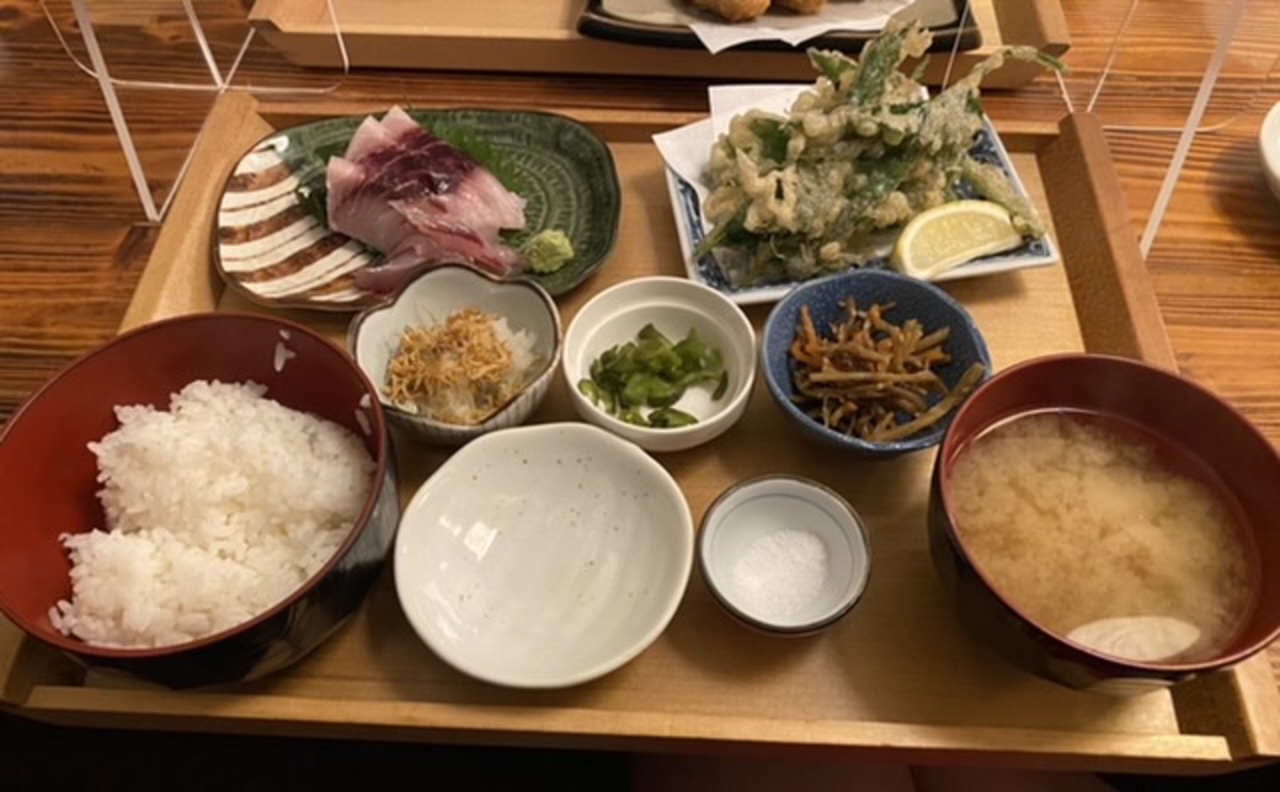 食べたのは明日葉天と刺身定食1,500円!明日葉天も刺身も美味しかったです。息子は何故かカキフライ定食を。
