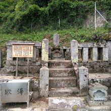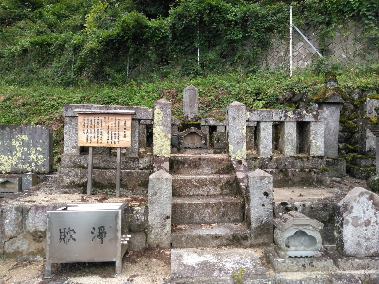 蓮華寺にあります。広い無料の駐車場から石段を上がると本堂があって、その左奥に進み、墓地の間の坂道を上がると、七面堂があって、その横には江島像が立っています。その前を右奥に行くと、一番奥に石柱に囲まれた「江島の墓」があります。