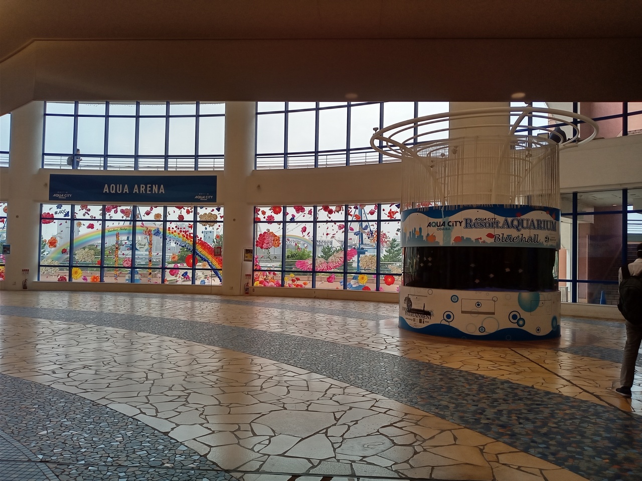東京 お台場にある「アクアシティお台場」の「AQUA AERA」には、円柱状の水槽が2つあり、熱帯魚やウツボなどの魚たちが泳いでいます。窓からは、レインボーブリッジも見えとても眺めも良いです。